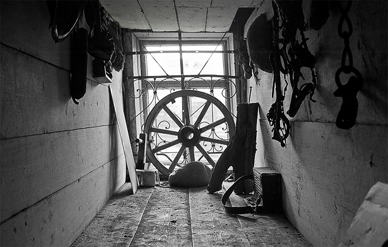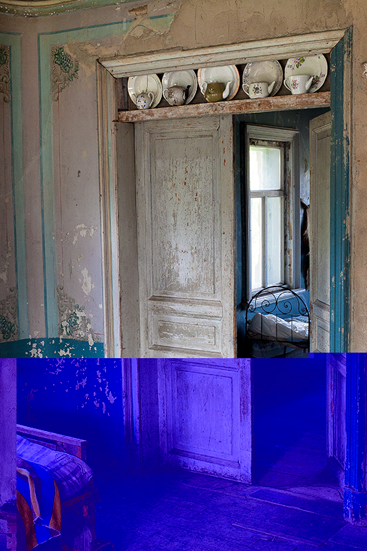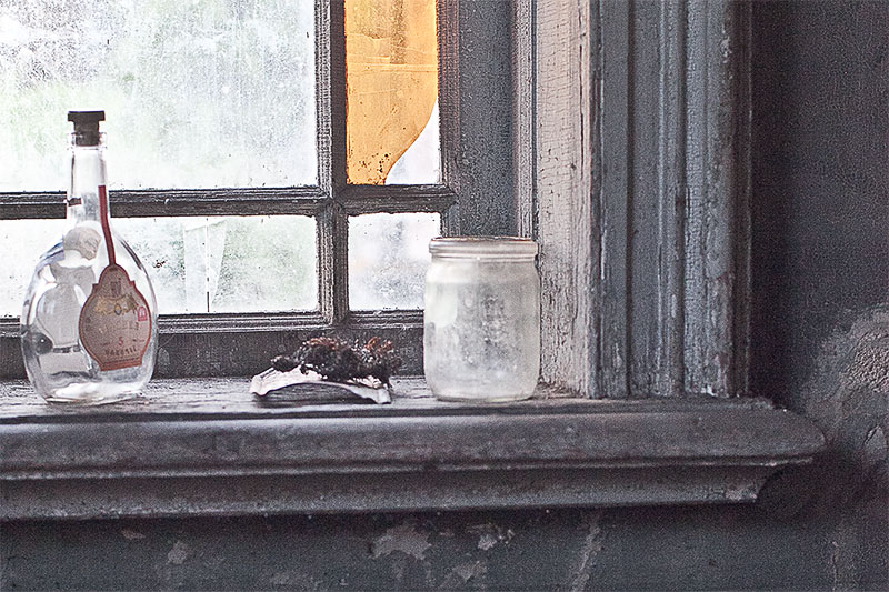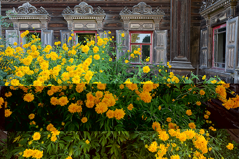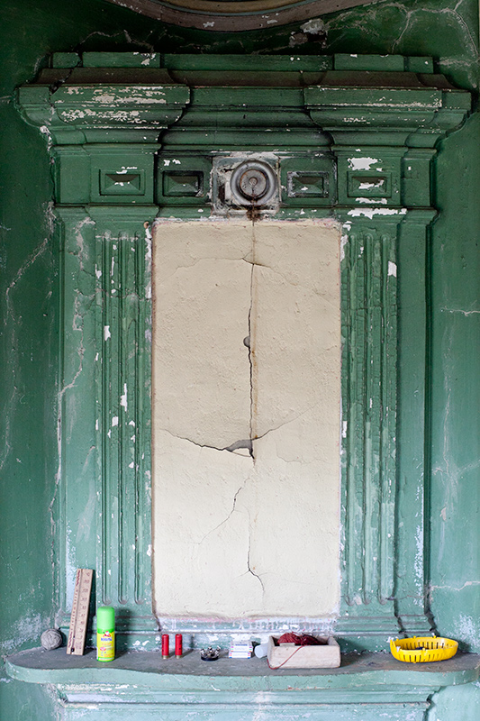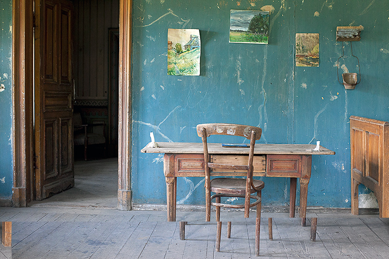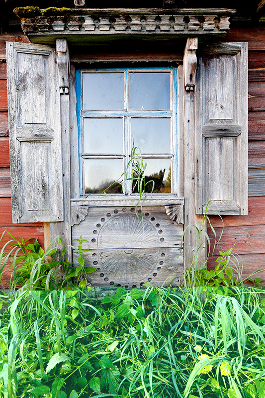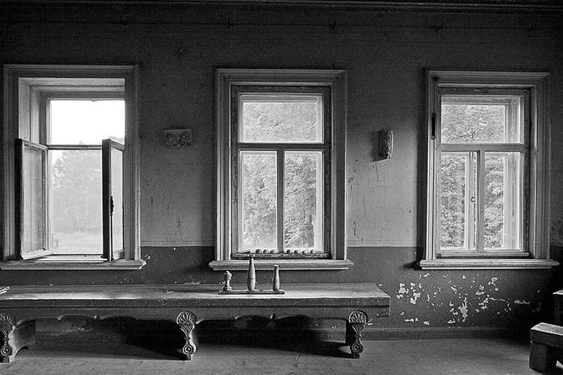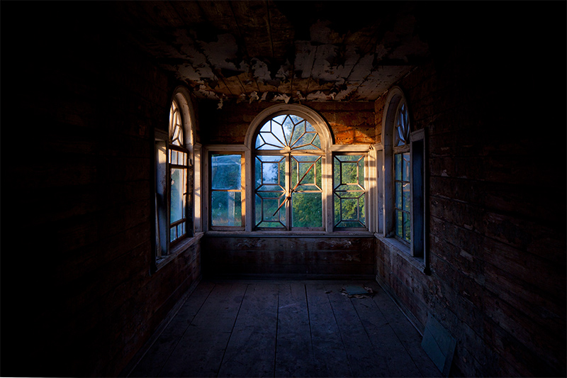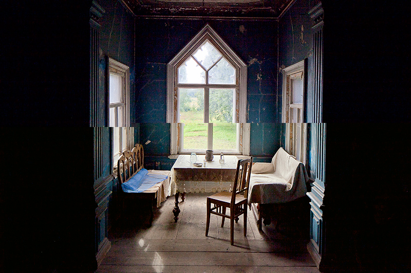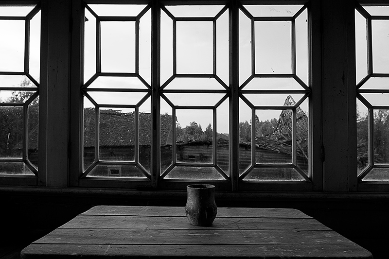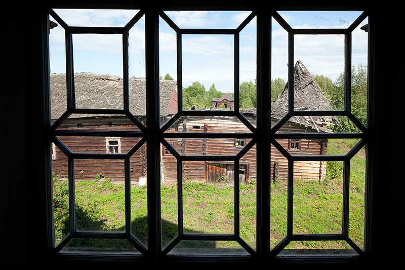 Через витражные окна экркеров можно наблюдать за безжалостным наступлением природы и времени на покинутую деревню. Изба Лукича, председателя Погореловского колхоза, крепкая еще несколько лет назад, рухнула этой зимой. Через проем, образовавшийся на месте крыши, теперь видна часовня, построенная на деньги Поляшова.