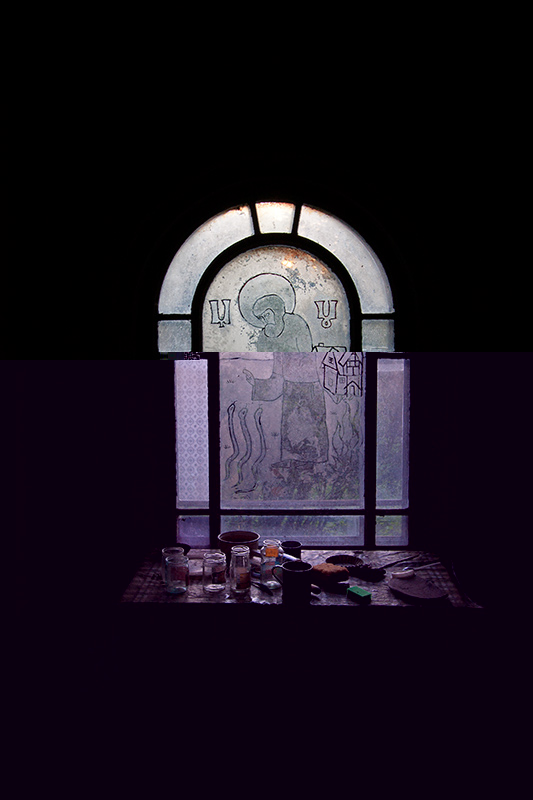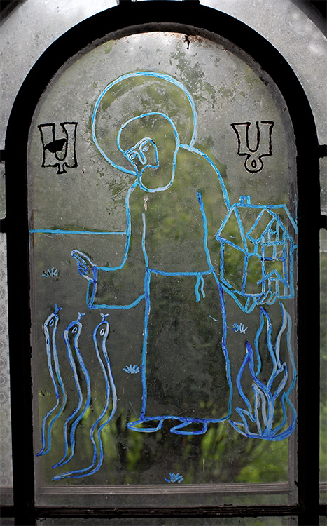 Эркер рядом с кухней. В витраже Толин друг нарисовал Макария Унженского - покровителя Погорелово. День его памяти, 7 августа - престольный праздник Погорелово. Хотя деревня давно уже вымерла, окрестные жители все еще помнят о празднике - в этом году нас поздравляли. думаю, только особым вмешательством Макария можно объяснить то, что дом хранился все эти годы.