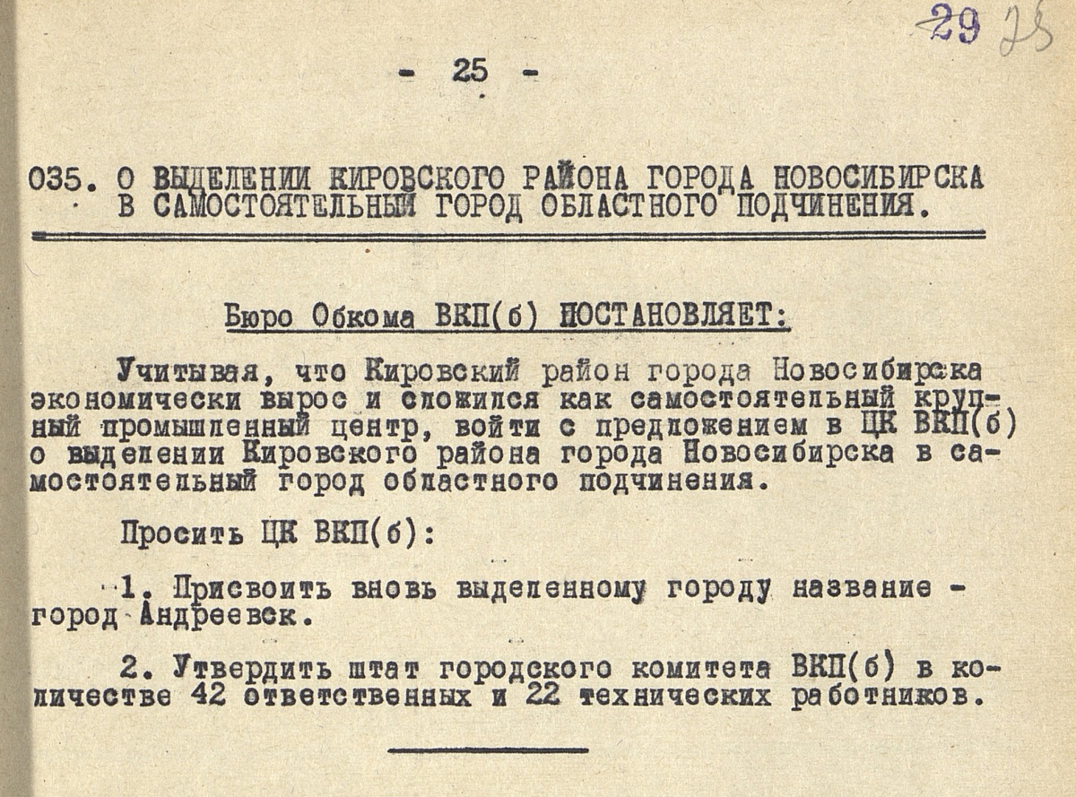 Левый берег Новосибирска должен был стать отдельным городом Андреевском в 1942 годуЛевый берег Новосибирска в 1942 году мог стать самостоятельным городом с названием Андреевск. Документальное свидетельство об этом нашел сотрудник Музея города Новосибирска Константин Голодяев в ходе работы в Партийном архиве Новосибирской области. Обком ВКП(б) предлагал выделить Кировский район в самостоятельный город областного подчинения и присвоить ему название Андреевск. Почему новый город должен был называться Андреевском, К. Голодяеву пока выяснить не удалось. Сюжет требует дальнейшего исследования, в том числе в архивах Москвы, говорит краевед. В состав нового города должен был войти весь левый берег Новосибирска. В 1940-е он был единым Кировским районом и являлся самым большим по площади и населению в городе. Партия предлагала сделать левый берег отдельным городом в связи с тем, что он достиг больших успехов в промышленном развитии. «Бюро Обкома ВКП(б) постановляет: Учитывая, что Кировский район города Новосибирска экономически вырос и сложился как самостоятельный крупный промышленный центр, войти с предложением к ЦК ВКП(б) о выделении Кировского района в отдельный город областного подчинения», – говорится в постановлении бюро. Партийцы имели в виду, что с началом войны левый берег за несколько лет стал крупным индустриальным узлом за счет предприятий, эвакуированных из европейской части СССР. В документе даже есть решение утвердить штат аппарата горкома города Андреевска в количестве 42 «ответственных работников». На этом документальная цепочка пока обрывается. Видимо, Москва не поддержала создание Андреевска. Причины этого решения требуют дополнительного исследования. Справка: История ЛевобережьяВосемьдесят пять лет назад, 20.10.1930 г., высший законодательный орган
