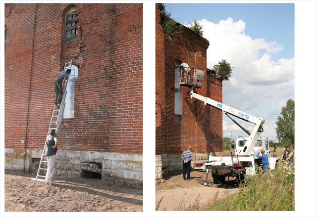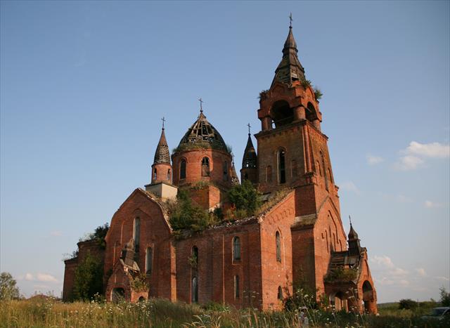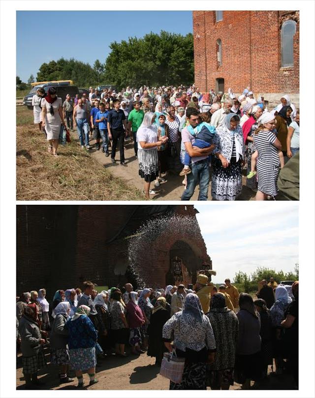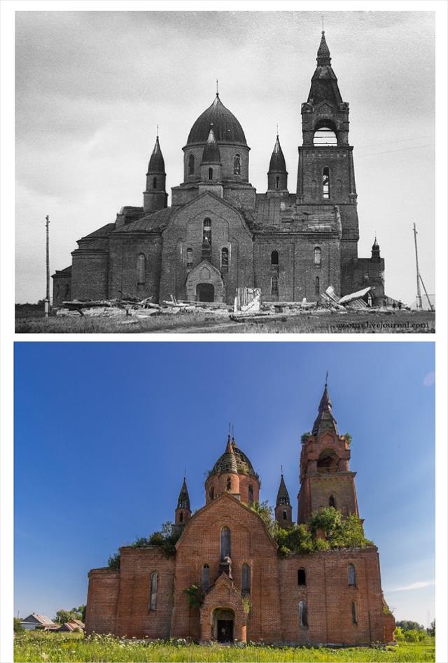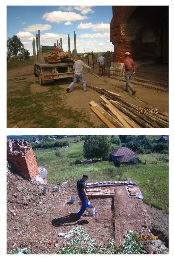 Фото сверху - алтарная часть Введенского храма в с. ПётПителинского района Рязанской области, фото снизу - алтарная часть Церкви Алексия Метрополита Московского в пос. Тайцы Гатчинского района Ленинградской области, сделанное Игорем Майоровым в феврале 2015 года. Год постройки церкви между 1916-1922 гг. Несомненно, необходимо воскресить этот храм - памятник архитектуры из небытия и вдохнуть в него новую жизнь! СегоДня. Успехи. После развратного, все дозволенного, безнаказанного опьянения демократией в Россию пришло тяжкое похмелье, где народ увидел, что натворил. Натворил сам, вместе, радуясь... И захотелось людям покаяться за прошлое и помолиться за будущее. За то, чтобы их дети и внуки не знали такого разрушительного опьянения. Уже около 10 лет местные жители пытались привлечь внимание спонсоров и восстановить храм, но дело дальше старта не продвигалось. И вот в 2015 году по благословению Епископа Касимовского и Сасовского Дионисия началось медленное восстановление церкви. Небольшая группа активистов, упорно верящих в успех дела, из числа местных жителей, неравнодушных мирян Москвы и других городов взялись за дело. За три теплых месяца мая, июня и июля активистам удалось: - расчистить храм от земли на высоту до 60 см. - расчистить крыши северного, западного и южных входов в храм от растительности. - расчистить внутренне помещение храма от мусора и обвалившейся штукатурки. - расчистить часть подвального помещения в северо-западной части храма. - максимально закрыть оконные проемы поликарбонатом. - сделать временную алтарную перегородку. - в августе месяце добровольцы Добровольческого объединения молодёжи РеставросЪ при Патриаршем центре духовного развития детей и молодёжи Данилова ставропигиального мужского монастыря (г. Москва) аккуратно очистили всю крышу от буйной растительности, сделали лестницу на колокольню, продолжали расчистку подвалов восточной стороны. За что им огромное-огромное СпасиБо!!!