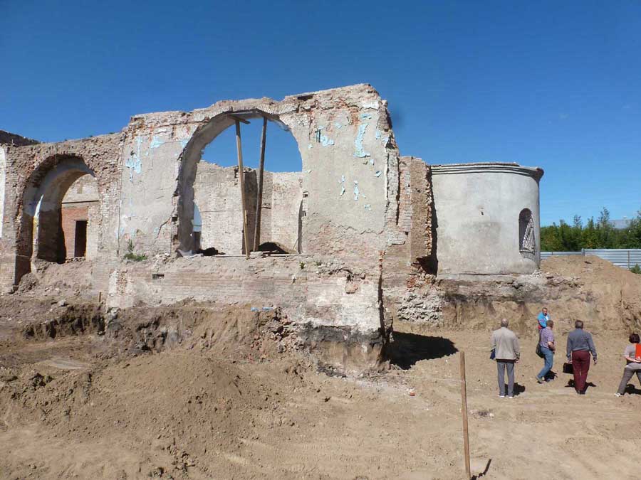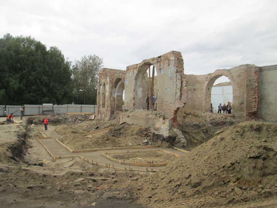 Подготовка котлована под устройство южного придела. При демонтажных работах была обнаружена историческая роспись свода арки между южным и центральным приделом.
