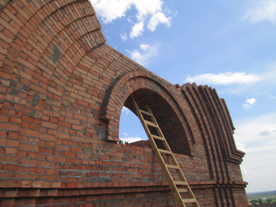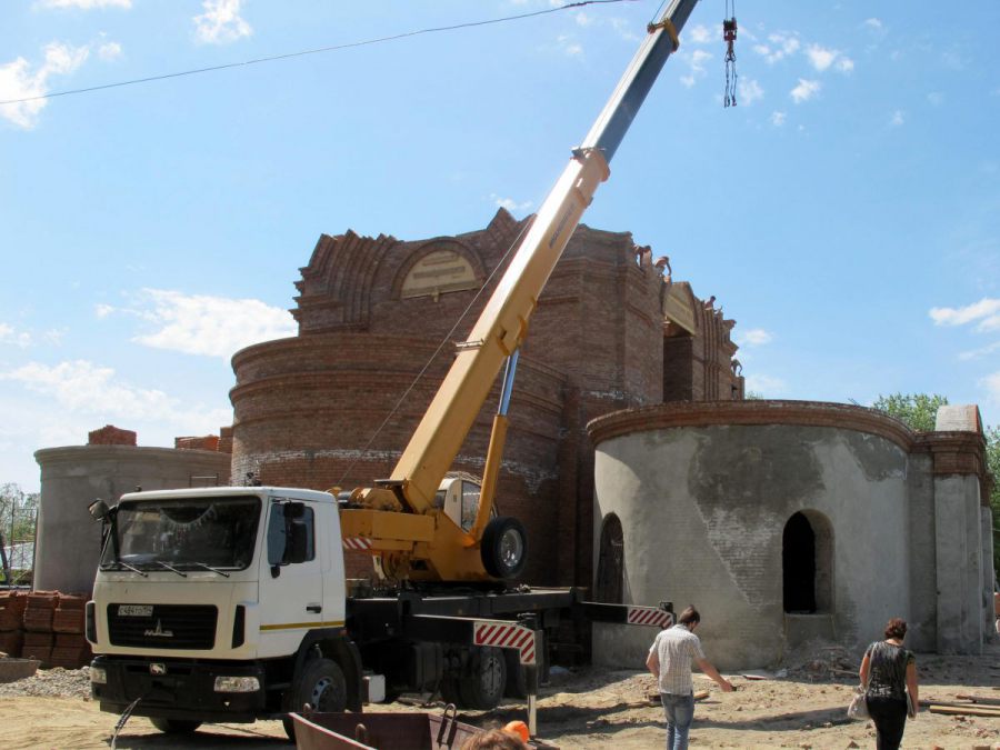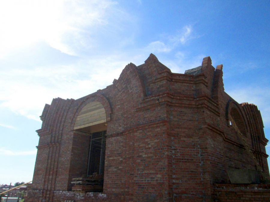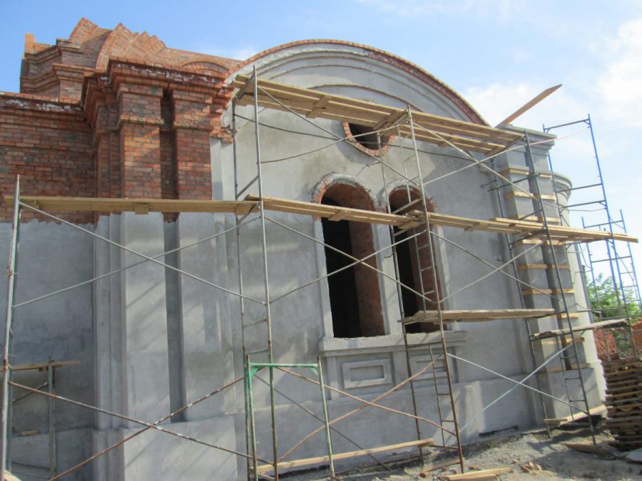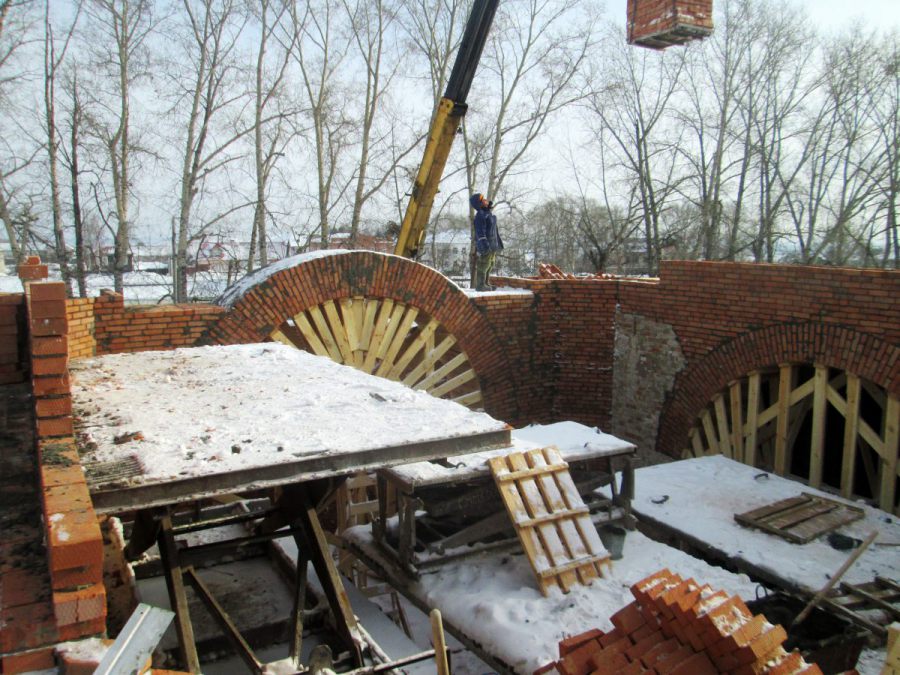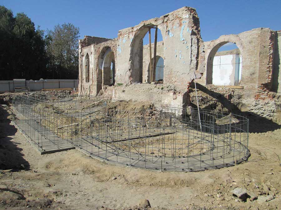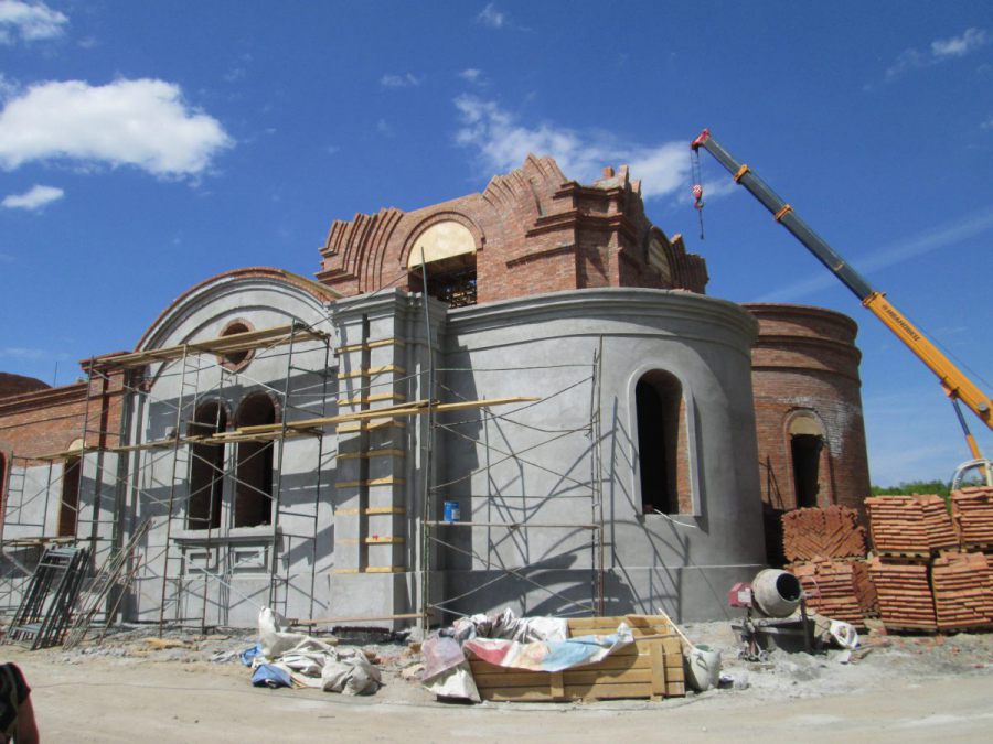 Возведение стен центрального притвора. Кладка стен южного придела. Восстановление арки центральной апсиды и арки между центральной частью и южным приделом. Восстановлены стены южного придела (выполнено аттиковое завершение со стороны западного фасада). Установлена опалубка для перекрытия южного придела. Ведутся работы по армированию перекрытия южного придела. Возведение стен колокольни. Западный и южный фасады. Установка балок колокольни, предназначенных под колокола. Оштукатуривание стен южного придела. Возведение кирпичных стен центральной части храма под купол. Вид с восточка. Возведение стен центральной части. Южный и Восточный фасады. Сегментные стройтельные леса для устройства купола центральной части собора. Возведение арочного завершения стен центральной части храма под купол. Кладка арочного завершения стен центральной части собора. Устройство опалубки под конху для перекрытия апсиды.