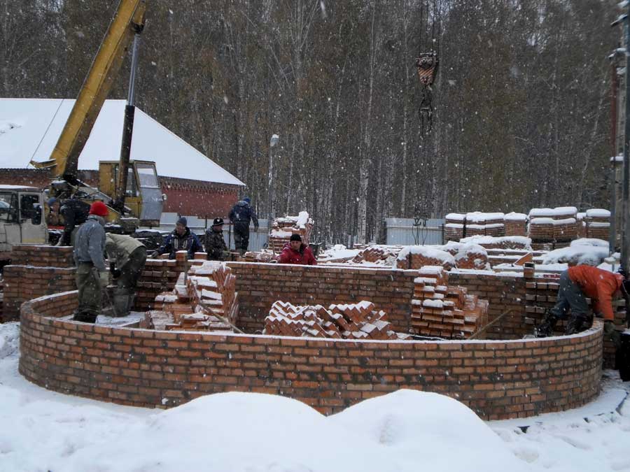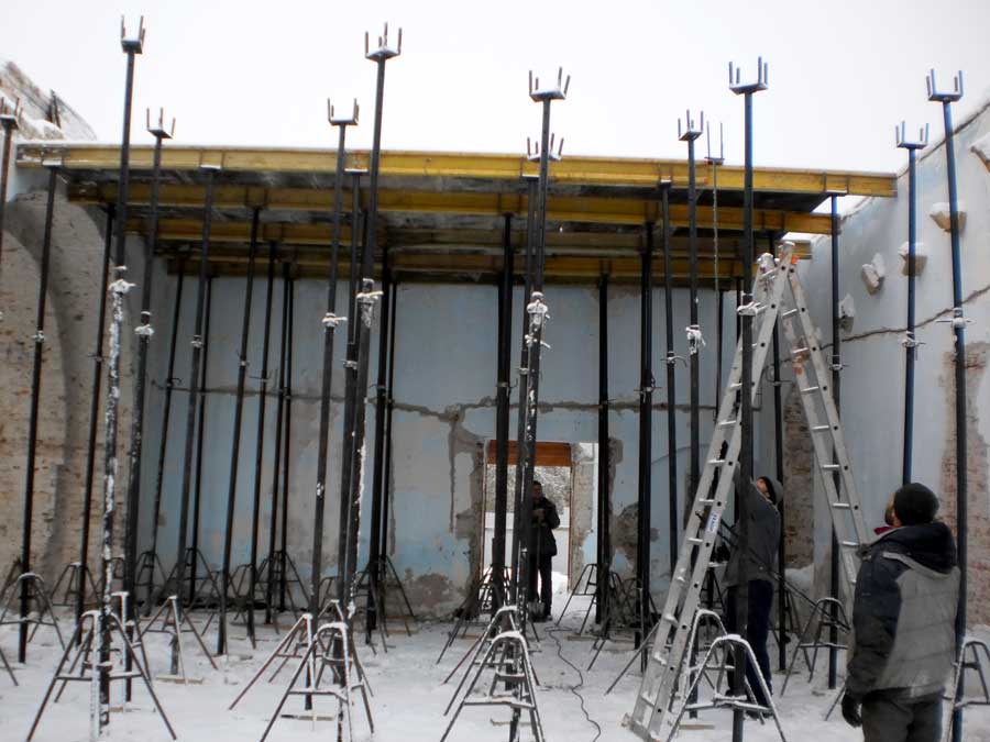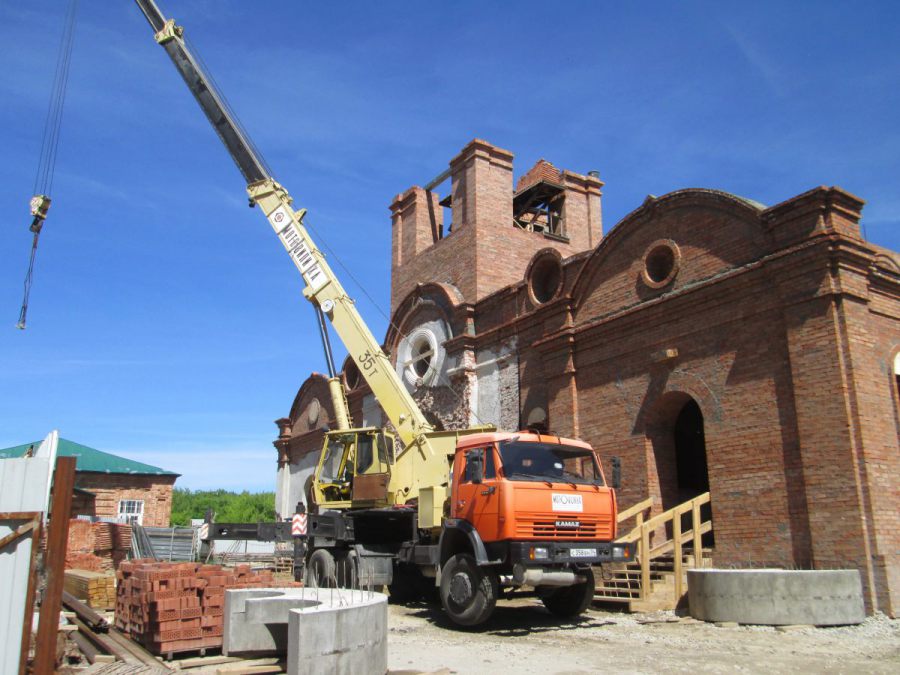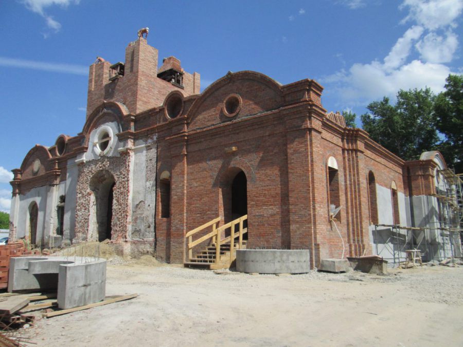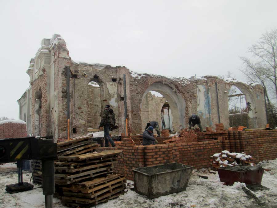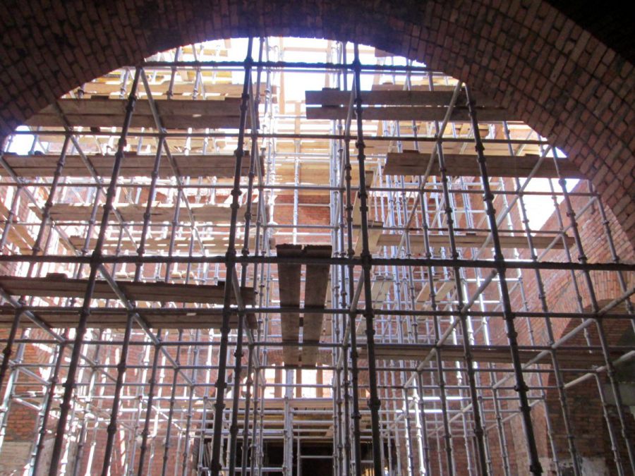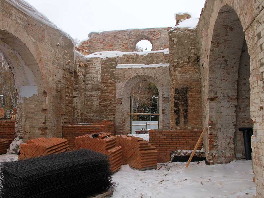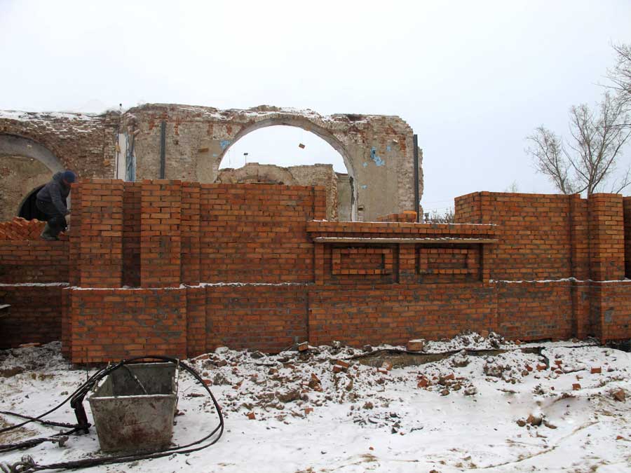 Возведение стен центрального притвора. Кладка стен южного придела. Восстановление арки центральной апсиды и арки между центральной частью и южным приделом. Восстановлены стены южного придела (выполнено аттиковое завершение со стороны западного фасада). Установлена опалубка для перекрытия южного придела. Ведутся работы по армированию перекрытия южного придела. Возведение стен колокольни. Западный и южный фасады. Установка балок колокольни, предназначенных под колокола. Оштукатуривание стен южного придела. Возведение кирпичных стен центральной части храма под купол. Вид с восточка. Возведение стен центральной части. Южный и Восточный фасады. Сегментные стройтельные леса для устройства купола центральной части собора. Возведение арочного завершения стен центральной части храма под купол. Кладка арочного завершения стен центральной части собора. Устройство опалубки под конху для перекрытия апсиды.