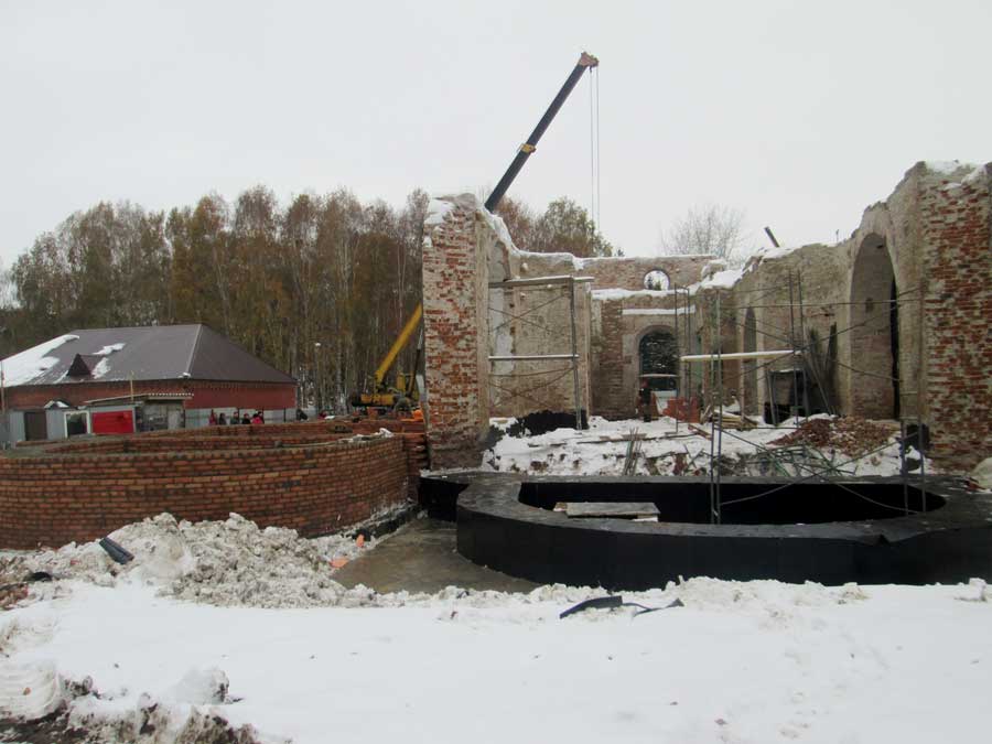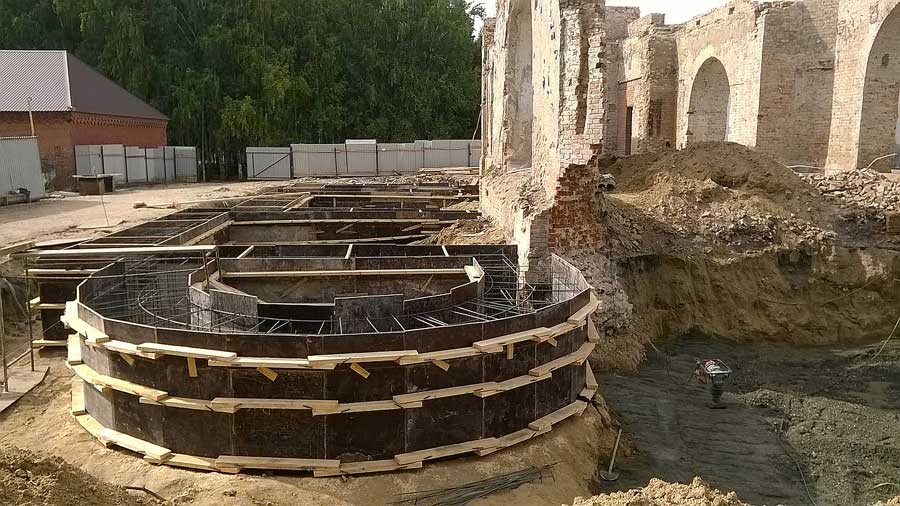 Выполнена гидроизоляция цокольной части стен центрального придела и обратная засыпка фундамента южного придела.