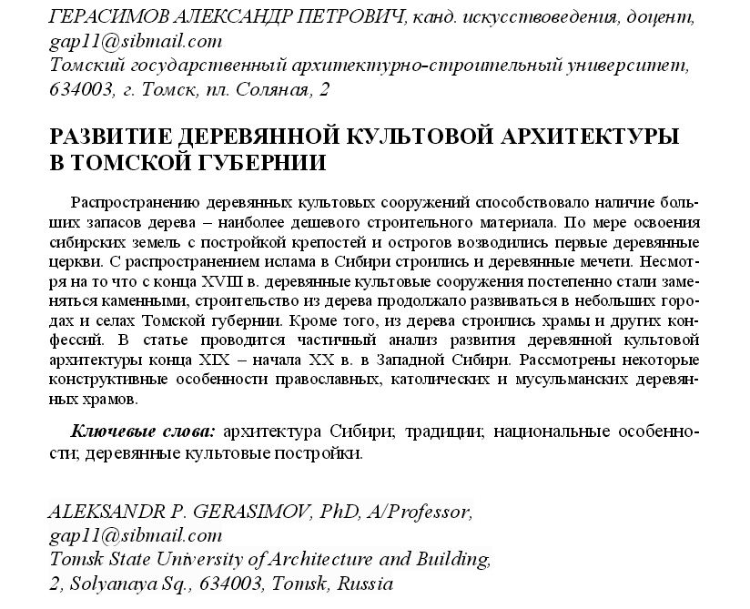 Развитие деревянной культовой архитектуры в Томской губернииГЕРАСИМОВ АЛЕКСАНДР ПЕТРОВИЧ, канд. искусствоведения, доцент, Томский государственный архитектурно - строительный университет. ![]()