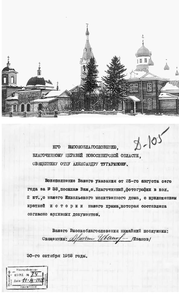 К 70-летию со дня освящения Никольского храма в Болотном Из истории Никольского храма Храм святителя Николая был одним из трех храмов Новосибирской области, богослужение в которых совершалось непрерывно с 40-х годов безбожного ХХ века. Болотное возникло как притрактное село на Московско-Иркутском тракте в 1804-1805 годах. Первый болотнинский храм был построен и освящен в 1843 г. во имя трех святителей Петра, Алексия и Ионы Московских. 2 февраля 1864 г. церковь сгорела. 9 июня 1867 года была освящено новое церковное здание с престолом во имя святителя и чудотворца Николая. В 1912 г. оно было перестроено в соответствии с планом, утвержденном в 1911 г. и освящено 2 декабря 1912 года. Распоряжением Облисполкома № 35 от 10 февраля 1940 г. храм закрыли, в 1952 году здание сгорело. Вашему вниманию предлагается донесение настоятеля Болотнинского храма иерея Михаила Иванова отцу благочинному Александру Тугаринову в Новосибирск от 30 октября 1958 года. Этот архивный документ представляет собой уникальное окно в прошлое, позволяющее вглянуть на события более чем полувековой давности. Это одно из первых описаний возникновения прихода, устройства Болотнинского храма, его освящения. Здесь представлена информация о клире, о службах, о переустройстве храма.