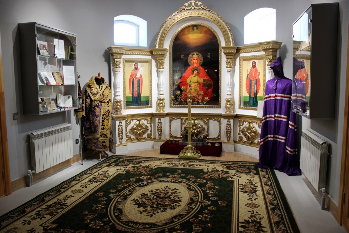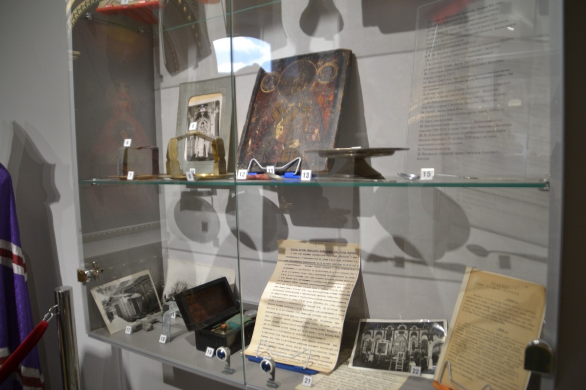 приготовленному проекту. Открытие музея состоялось 3 мая 2019 года. ![]() ![]() ![]() Всего в помещении 5 залов, 6-й зал совмещен с гардеробом. Все они, кроме центрального, повторяют контуры храма и не превышают по площади 20 кв. м. Центральное помещение – около 40 кв. м. В помещении крипты алтаря разместились иконы Божией Матери «Державная» и новомучеников Новосибирских Николая Ермолова и Иннокентия Кикина. В пяти выставочных залах и вестибюле демонстрируются более 100 предметов и документов, специальные макеты, информационные планшеты. Исходя из площади помещений, был создан формат и размер стендов и витрин. Всего в залах есть возможность комфортно разместить 14 витрин, к открытию музея было подготовлено 11. Идея создания музея в одном из помещений церковного здания возникла на стадии проектирования храма, благоустройства источника. Экспонаты музея, сведения о репрессированных в Новосибирской области собирались в процессе реализации проекта. С 2003 года приходом «Живоносный Источник» города Искитима начался плановый сбор документов и предметов музейного значения. В 2017 году Искитимской епархией был объявлен сбор экспонатов и сведений, связанных с репрессиями в Новосибирской области. Больше всего обращений поступило от детей и внуков репрессированных людей. К сожалению, прошлое мало сохранило материальных объектов. Некоторые из обратившихся просили помощи в поиске сведений о своих родственниках. За это время удалось собрать немного, всего 200 экспонатов. Это фотографии, документы и личные вещи людей, прошедших сквозь горнила репрессией. ![]() ![]() ![]() ![]() В составлении предметной экспозиции особую категорию составляют личные вещи, документы и фотографии священнослужителей, пострадавших за веру. Среди них – личные вещи иерея Иакова Мазаева (1885—1937) последнего священника села Легостаево Искитимского района Новосибирской области, барнаульского священника Александра Шаркова (1885—1933). Эти вещи были частью семейного наследия, использовались в быту. Среди уникальных экспонатов – личные вещи священномученика Новосибирского Николая Ермолова (1874—1937), переданные внуками святого. Это и подписанные святым книги из его личной библиотеки с экслибрисом, и требник с надписью «с. Ордынское» (из частной коллекции), где он провел свои последние годы служения, а также пояс для подрясника, подсвечник и посуда. На витринах можно увидеть и тетрадь митрополита Нестора (Анисимового) (1885—1962) с переписанными его рукой дневниками святого праведного Иоанна Кронштадтского. ![]() ![]() ![]() ![]() ![]() ![]() Кроме того, здесь представлены личные вещи священнослужителей Новосибирской епархии, ушедших из жизни совсем недавно, но прошедших испытания в советский период: архимандрита Макария (Реморова) (1907—1998), игумена Василия (Гремякина) (1922—2012), иеромонаха Иосифа (Бирюкова) (1922—2018). Отец Игорь Реморов стал священником в 1927 году. Из-за гонений был вынужден бежать из Тамбовского края. Батюшка вовремя уехал перед арестом в Бийск, где работал бухгалтером. Пройдя Великую Отечественную войну осенью 1945 года, вернулся в Бийск и вновь стал работать бухгалтером. В 1956 году митрополит Новосибирский и Барнаульский Нестор благословил отца Игоря продолжить священническое служение. Протоиерей Валентин Бирюков пережил раскулачивание и переселение в Томскую тайгу. Другие важные экспонаты прина