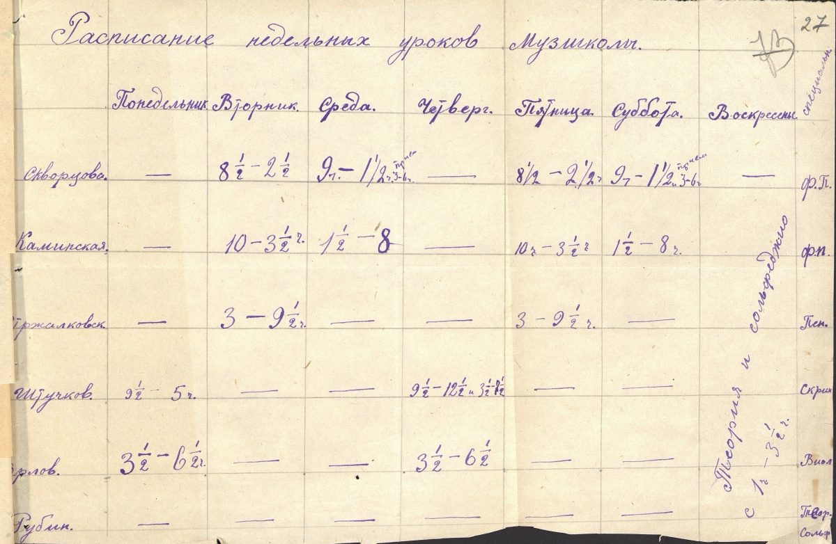 В отчёте школы за апрель-июнь 1922-го она называется «1-й Советской музыкальной студией». А в октябре 1925-го, видимо, произошла реорганизация школы в музыкальные курсы. Или их параллельное существование как ступени к созданию техникума. Сменился и вырос преподавательский состав. В 1925/26 годах в их списке значились: Скворцова (фортепиано), Рубин Владимир Александрович (теория музыки), Нечай-Стржалковская Антонина Николаевна (сольное пение), Аносов Сергей Исаевич (хоровое пение), Котляревская Татьяна Михайловна (фортепиано), Копгеккер Фёдор Семёнович (скрипка), Мительман Наум Яковлевич (скрипка), музыканты госоперы Цынман Михаил Матвеевич (скрипка), Орлов Михаил Захарович (виолончель), Каминская Галда Аровна (фортепиано) и другие. Кстати, у Антонины Николаевны Стржалковской позднее будет учиться звезда новосибирской оперной сцены Надежда Александровна Дезидериева, в 1964 году ставшая директором нашей детской музыкальной школы № 1, и благодаря энергии которой для школы было выстроено нынешнее здание. Состав преподавателей сильно зависел от «переменного состава оркестра Сибгосоперы». Количество учащихся тоже постоянно «плавало». Третий учебный год 1921/22 годов окончили 78 учащихся, среди которых было и 5 взрослых, на четвёртый набрали уже 120 человек. В 1925 году в отчёте директора указывается от 24 до 74 учащихся, на конец 1926 года – 41 человек [10]. Вышестоящая организация отслеживала работу школы. В газете «Советская Сибирь» от марта 1926-го мы встречаем материал о «закрытом учёте работы учащегося по классу скрипки преподавателя Абрама Исидоровича Штучкова. Несмотря на кадровые трудности, комиссия ОкрОНО и Рабиса отметила: «производственный учёт показал всё же наличие в школе кадра способных учеников, серьёзное отношение их к своей работе и значительные достижения в пределах курса 1-ой ступени нескольких учеников старшей группы». На 28 марта был назначен публичный отчётный концерт школы в большом зале Сибгостеатра [3]. В апреле 1926 года Крайрабисом было проведено обследование состояния Первой советской музыкальной школы. В итоговом отчёте сразу же отмечено: «6-тигодовое существование школы в самых ужасных условиях хозрасчёта громко говорит, что школа для Новониколаевской губернии нужна действительно» [10]. Ставятся вопросы «твердой материальной базы», удержание высококвалифицированных преподавателей. Есть у нас и данные о выпускниках. Хотя бы об одном. В областном архиве отложилось ходатайство Скворцовой о направлении «Долгих Марии Степановны, обучавшейся на новониколаевских музыкальных курсах ГубПрфОбра по классу фортепиано в Москву для продолжения музыкального образования в Московской Государственной консерватории» [10]. Девятого июня 1926 года Президиум СибКрайРабиса снова рассматривает вопрос «О положении музыкальной школы». В докладе Соколовой всё тоже: нет средств, нет инструментов, состав преподавателей ежегодно меняется, требуется материальная поддержка. Постановили: отметить необходимость школы и её «включение в сеть местного бюджета на 26/27 уч. год» [10]. Но вместо этого резолюция была однозначна: «не имеется возможности». В августе 1926 года сформирован обстоятельный проект открытия в Новосибирске государственного музыкального техникума с балетным классом. Готовивший проект директор Сибгосоперы М.Я. Крамер включил в новый у