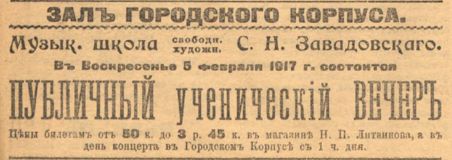Из специализированых дореволюционных музыкально-образовательных учреждений чаще всего отмечается школа Стефана Завадовского. Стефан Николаевич окончил Московскую консерваторию, работал преподавателем в женской гимназии А.П. Смирновой, ново-николаевском реальном училище им. Дома Романовых. Его новая музыкальная школа была открыта 01.09.1916 года и декларировала среднее музыкальное образование для подготовки к поступлению в консерваторию.