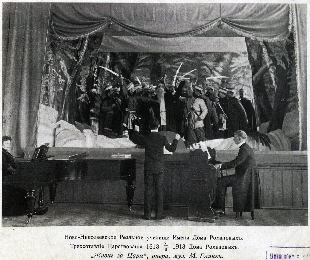Причём, город очень заботливо относился к этому правительственному училищу, находил «необходимые средства на приобретение музыкальных инструментов для духового и струнного оркестров и ежегодно отпускал суммы на преподавание пения и музыки». В феврале-марте 1913 года в реальном училище, получившем имя Дома Романовых, трижды был представлен спектакль «Жизнь за царя» Глинки, в котором пел сводный хор самого «училища и женской гимназии в количестве до ста человек» [6]. Музыкальное сопровождение обеспечивалось роялем и фисгармонией (Генрих Мартынович Ассофрей) и роялем (Анна Ивановна Изосимова). В 1905–1906 годах после приезда в наш город Изосимова вела частный фортепьянный класс. Она проводила занятия в своей квартире на Николаевском (ныне Красном) проспекте, где у неё стояло 4 рояля [12]. Среди газетных объявлений той поры мы также находим и информацию о частных уроках по обучению пению и игре на разных инструментах. Среди них пианисты З.Ф. Родина, М.Н. Мелиссова, скрипач Б.Б. Перельман, капельмейстер О.А. Ганишта. Более сотни человек получили музыкальную подготовку в составе великорусского оркестра народных инструментов под управлением Григория Евгеньевича Авксентьева, образованного в 1913 году. Активно преподавалось пение и в Учительской семинарии на Кузнецкой улице (теперь на её месте расположен магазин «Универсам»). В «Правилах для поступающих» в это учебное заведение даже значилось: «Неспособные к музыке и пению - не принимаются». Её учащийся Федор Дмитриевич Останин вспоминал: «Каждый вечер в общежитии слышалась музыка, пение - групповое и сольное. Буквально все старшеклассники обязательно играли на каком-либо, и даже не на одном, музыкальном инструменте. Играли свободно по нотам, сходились в дуэтах, трио, квартетах. Пели также свободно - и по нотам, и без нот» [14]. Преподавателем пения здесь состоял соборный регент Севастьян Савельевич. Он создал из учеников семинарский хор. Десять часов пения и музыки входили в таблицу недельных уроков и в Ново-Николаевском учительском институте, открытом в январе 1917 года [13].