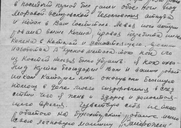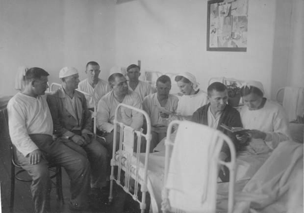 Освоение ранеными профессии токаря. (Музей Новосибирска) "В э/г № 1239 организован кружок со швейным профилем, в котором обучается 30 человек, а 32 человека уже закончило обучение и трудоустроено на работы по новой специальности. В э/г 1238 на курсах счетоводов обучается 60 чел. В э/г 1242 на курсах финансово-банковских работников занимается 60 чел. В э/госпитале 2 492 производится обучение глухонемых <…Трудоустроено через горсобес в Новосибирске 115 чел., через Облсобес 170 чел., а всего 285 чел. Направлено в интернаты инвалидов отечественной войны 104 чел." [2, Оп. 6. Д. 3. ЛЛ.102-106 об]. История новосибирских госпиталей полна словами благодарности от раненых бойцов: "Завтра, исполненный новых сил, я уезжаю из госпиталя. Изголодавшийся по боям, восстановленный прочно и на совесть, я в неоплатном долгу у врачей, этих бодрствующих по ночам патриотов, которые возвращают способность утолить жажду мести проклятому врагу". Поляков, инвалид отечественной войны: "Выполняя боевое задание командования на фронте, я был тяжело ранен в грудную клетку. Пуля застряла в легких. Требовалась сложная операция, за которую не решались взяться даже крупные специалисты. А вот здесь, в Новосибирском госпитале, где начальником был доктор медицинских наук, профессор Хмельницкий, меня оперировал хирург, доцент А. Г. Киселев. Операция прошла блестяще. Теперь я снова в строю. От всей души благодарю за это доктора Александра Григорьевича Киселева". Чеботов, раненый госпиталя № 3609: "Помню в тот день, когда меня девушки санитарки на носилках вносили в эти приятные стены, переговаривались между собой: "Этот у нас второй". Что именно, я этого понять не мог, т.к. у меня была температура 41,8, но после я узнал, что первый оставил жизнь в этих стенах <…Благодаря советским врачам моё лечение шло быстро. Замечательный и настойчивый хирург Сапожников Константин Георгиевич, который не оставил меня калекой, но спас мне жизнь, сделал суставную операцию в области колена. Несмотря на указание профессора, который настаивал на ампутации. Я его вспоминаю, и буду вспоминать с благодарностью до конца своей жизни".