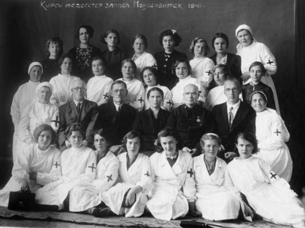 Курсы медсестёр запаса, 1941 (Музей Новосибирска) Кудряшова Мария Никитична: "Мы работали по 3-4 часа на заводе, остальное время обучения на краткосрочных курсах медсестер РОККа. Время распределялось так: днём теория, а практика - вечером и ночью в госпитале. Мы принимали раненых, обовшивленных, в ранах - черви. Раны обрабатывали в операционных и распределяли раненых по палатам". Огромная работа была проделана специально созданной чрезвычайной противоэпидемической комиссией. В условиях перенаселённости, неразвитости системы водоснабжения и канализации она обеспечила не только недопущение массовых заболеваний, но и улучшение санитарного состояния города, открытие новых бань, прачечных, камер дезинфекции, прививание медперсонала и раненых. Круглосуточно работал санитарно-контрольный пункт, осматривающий военные эшелоны и проводя их санитарную обработку. Кроме того, медобслуживание осуществлялось и для гражданского населения, работников оборонных предприятий. За военные годы количество лечебных заведений в Новосибирске выросло на 71%, чисто больничных коек на 50% [3, Стр. 44]. Среди населения проводилась санитарно-оборонная работа. Массовый характер приняла сдача норм ГСО (готов к санитарной обороне) и БГСО (будь готов к санитарной обороне). Развивалась и сеть больничных учреждений при предприятиях. Также в обязанность медучрежденям была поставлена задача трудоустройства инвалидов войны. Для них в корпусах пионерских лагерей создаются интернаты. Для выздоравливающих рабочих шефские заводы открывали при госпиталях цеха, а для освоения навыков рабочей профессии организовывали мастерские и курсы. После реабилитации большая часть инвалидов продолжила трудовую деятельность.