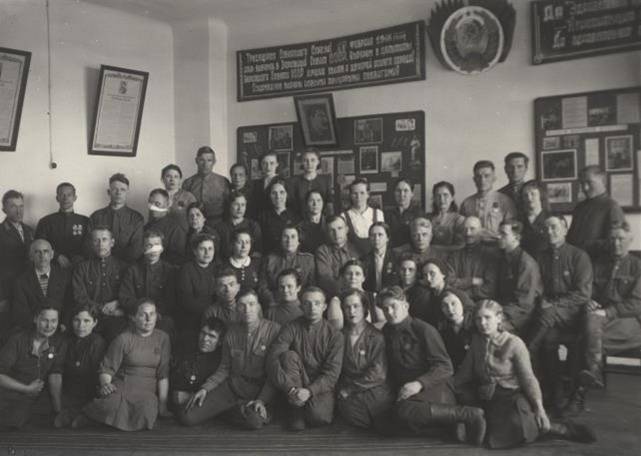 На фото: группа награждённых врачей, медсестер и раненых эвакогоспиталя № 1503, Красный пр-т, 42 (Музей Новосибирска) И бывшие раненые не забывали своих спасительниц. Лютова Ирина Васильевна, комсорг Оловозавода: "Долгое время пролежал в госпитале тяжелобольной лётчик из Ленинграда. Когда он стал немного вставать на ноги, мы его заново учили ходить. Позже он прислал группе оловозаводских шефов благодарность через газету".