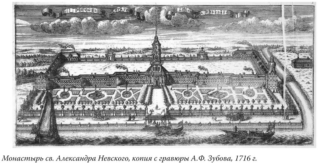 Образ Александра Невского видят над Владимиром в 1491 году, спустя год после окончательного свержения ордынского ига. В 1552 году царь Иван Грозный, отправляясь на покорение Казанского ханства, молился у гробницы святого Александра Невского во Владимире и 1 октября, в праздник Покрова, взял штурмом неприступную Казань. И при покорении Астрахани в 1556 году и при отражении нашествия на Москву крымского хана Девлет-Гирея в 1571 году русскому народу была явлена чудесная помощь и заступничество святого князя Александра Невского. В чудесных видениях князь Александр Ярославич предстает непосредственным участником битвы на Молодях в 1572 году, когда войска князя Михаила Ивановича Воротынского разбили крымского хана Девлет-Гирея всего в 45 километрах от Москвы. В историческом времени князь Александр Невский из местночтимого владимирского святого стал небесным покровителем Российской империи. И в этом, без сомнения, мы видим особый Промысл Божий. Петр I обратился к памяти Александра Невского в годы войны со Швецией. 16 мая 1703 г. у устья Невы императором Петром I по совету святителя Митрофания* Воронежского была основана крепость Санкт-Петербург. _____________________ *Петр говорил после кончины владыки: «Александр Македонский основал свою новую столицу в дельте Нила. А я свою новую столицу водружу в дельте Невы! И будет она памятью пожеланию Митрофания Святого старца». Во время посещения им берегов Невы потомки новгородцев указали место битвы со шведами в 1240 году. Весной 1704 года Петр I лично определяет здесь место для возведения монастыря. Свято-Троицкий Александро-Невский монастырь был основан Петром на Невских берегах одновременно с переездом царского двора в Петербург. В третью годовщину Ништадского мира*, 30 августа 1723 года, рака с мощами святого благоверного князя Александра Невского из древнего Владимира прибыла в Петербург и под пушечный салют и колокольный звон торжественно помещена в освященную к этому событию монастырскую церковь Александра Невского. В церемонии участвовал сам Петр I. __________________ *День памяти Александра Невского было указано отмечать 30 августа (дата заключение Ништадтского мира). При освящении в монастыре 30 августа 1790 года Троицкого собора мощи положены в нем, за правым клиросом , в серебряной раке, пожертвованной императрицей Елизаветой Петровной в 1753 году , на изготовление которой мастерами Сестрорецкого оружейного завода пошло около 90 пудов чистого серебра*. ___________________ *Между прочим, это серебро – первая продукция только что открытых сибирских, алтайских «Колыванских рудокопен»! – Ю.Ф. В 1799 г. Александро-Невский монастырь, ставший к тому времени крупнейшим монастырем России, был наименован лаврой. В XVIII в. в Александро-Невском монастыре были похоронены многие видные военачальники. Так, церковь Благовещения Пресвятой Богородицы, расположенная в первом этаже под церковью Александра Невского, стала местом упокоения генералиссимуса А.В. Суворова*; на его могиле – простая мраморная доска с лаконичной надписью: «Здесь лежит Суворов». В этой же церкви находятся могилы фельдмаршалов В.В. Долгорукого, А.Г. Разумовского, А.М. Голицына и др. ________________ *Александр Васильевич Суворов родился 13 ноября 1730 года, накануне дня Святого Александра Невского (23 ноября), и в честь его наречен был Александром. Еще с петровского времени Святейши