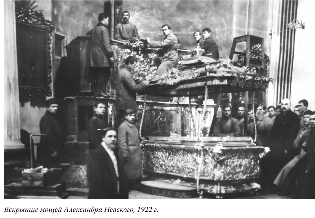 Восприятие его таким стало меняться после 1917 года. В 1918–1920 годах большевики развернули яростную антирелигиозную кампанию, в ходе которой было вскрыто и разграблено около 70 святых мощей. В мае 1922 года была вскрыта рака с мощами Александра Невского. Изъятая рака была передана в Эрмитаж, где и находится по настоящее время. Мощи из раки возвращены в лаврский Троицкий собор из запасников музея истории религии и атеизма в Казанском соборе только в 1989 году. Среди тысяч разрушенных и порушенных храмов в 20-30-е годы немало храмов, воздвигнутых в честь Александра Невского: Тифлисский Александро-Невский военный собор (Грузия),* собор святого благоверного князя Александра Невского** в Нижнем Новгороде, собор во имя святого благоверного князя Александра Невского в Новосибирске***, церковь святого благоверного Александра Невского в Томске ****и мн. др. ____________________ *Построен в память покорения Кавказа. Вмещал до 1000 человек. Собор был освящен 21 мая 1897 года. Разрушен по указанию Берия в 1930 году. На его месте был построен Дом Правительства. ** Построен в 1868-1881 гг. В 1929 году храм был закрыт, ценности изъяты, а зимой 1930 года по решению руководства Волжской флотилии иконостасы и все деревянные украшения собора пустили на дрова для обогрева местных домов. В подвале здания собора разместили склад, пристроили подсобные помещения под жилье и конторы. Во время Великой Отечественной войны на центральном барабане крыши действовала зенитная батарея , защищавшая небо г. Горького от налетов немецкой авиации . В 1983 г. началась реставрация собора. В июне 1992 г. собор был передан под управление Русской Православной Ц еркви. 12 сентября 2009 года собору присвоен статус кафедрального. *** Строительство собора во имя святого благоверного князя Александра Невскогов Новониколаевске (Новосибирске) велось в 1897 - 1899 годах . Собор был освящен 29 декабря 1899 года епископом Томским и Барнаульским Макарием . Храм был построен как памятник устроителю Великого Сибирского пути императору Александру III . Собор закрыт в 1937 году . Предпринимались попытки взорвать здание. В 1940-е годы в здании собора размещался проектный институт «Промстройпроект». В 1957 году в нем разместилась Западно-Сибирская студия кинохроники . За эти годы в соборе была полностью уничтожена роспись, устроены дополнительные перекрытия (образовалось три этажа, в куполе была сделана комната). В 1984 году здание передали Новосибирской филармонии . Движение за возвращение собора церкви развернулось в 1988 году , в год празднования 1000-летия Крещения Руси . Активное участие в нем принял митрополит Новосибирский и Барнаульский Гедеон (Докукин) . 25 августа 1989 года Новосибирский городской совет передал храм церкви. 15 мая 1991 года собор был освящен Патриархом Московским и всея Руси Алексием II . *** Церковь освящена в 1877 г. В 1920 г. храм был закрыт, купола разрушены, кресты сбиты. С 1920 по 1925 гг. здесь размещался Дом принудительных работ, потом несколько лет здесь хранились архивы, затем здание было передано типографии, использовалось под книжный магазин. В начале 1990-х храм был передан Русской Православной Церкви. Во второй половине 1930-х Александр был включен в новый патриотический пантеон как борец за независимость Руси против внешней угрозы с Запада. В 1937 году наряду с другими историческими личностями дореволюционной российской истории Алек