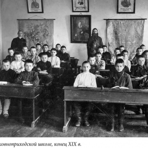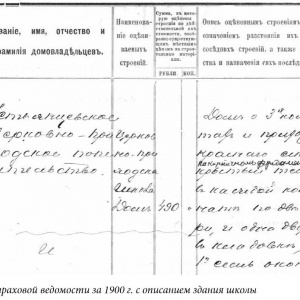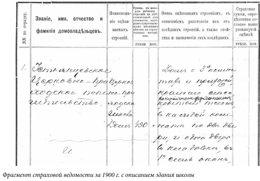 Таблица 1. Количество учеников в Устьянцевской церковно-приходской школе Содержалась школа на средства Епархиального училищного совета и добровольные пожертвования прихожан. Например, в 1886/87 учебном году от родителей учащихся детей двух школ Каинского округа (мало-жировской и устьянцевской) на их финансирование поступило 47 рублей [16, с. 18]. Кроме того, как отмечалось выше, разрешено было расходовать на нужды школы до 30 рублей из церковных денег. В 1887 году Епархиальным училищным советом на очередной трехлетний период получено пособие из земских губернских сборов, из фонда которого устьянцевской школе отпущено 100 рублей на обустройство нового здания [23, № 4, с. 10]. В 1889/90 учебном году на нужды школы израсходовано: 30 руб. – из церковных денег, 100 руб. – из кассы Епархиального училищного совета (для устройства школьного здания в счет земского пособия на 1890 год), и 165,5 руб. – «доброхотных» пожертвований на постройку здания, поступивших от попечителей и благотворителей [15, с. 22]. На 1895 год смета на содержание устьянцевской школы составила уже 120 руб., на 1896 год – 150 руб. [14, с. 6; 12, с. 14]. Среди множества архивных дел удалось обнаружить и подробное описание здания церковно-приходской школы за 1900 год, которое содержится в страховой ведомости общественных строений по нескольким селениям Нижне-Каинской волости. Согласно этому документу, школа располагалась в доме из трех комнат и прихожей, построенном из «красного леса» (т.е. сосны или ели) на кирпичном фундаменте и крытом тесом. Здание школы примыкало к церковной каменной и деревянной ограде. Длина стен составляла 12,8 м., высота потолков в комнатах – 2,5 м. В каждой комнате имелось по две двери, а в кладовке одна. Кроме того, в 1-й комнате 7 окон, во 2-й – 3 окна (в 3-й не указано), размер окон: высота 1,24 м, ширина 0,8 м. Стоимость дома оценена в 490 руб. К школе относился амбар, находившийся в двадцати метрах от нее. Он был построен из осинового и березового леса, крыт тесом, с одной дверью и двумя закромами. Стоимость амбара оценена по страховой ведомости в 10 руб. [2, л. 11об–12]. С 8 марта 1901 года при школе открыто церковное попечительство, а уже 9 ноября 1902 года епископом Томским и Барнаульским Макарием (Невским) преподано Архипастырское благословение (рез. № 3881) попечительнице устьянцевской церковной школы Елене Митрохиной за материальное содействие благоустройству школы [13, с. 7]. В 1908 году попечительницей по-прежнему значится Е. Митрохина, в 1913 году – Евдоким Михайлович Кетов. В ряде церковно-приходских школ обучение было бесплатным (таких в Каинском округе в 1886/87 учебном году было 40 из 87 школ), поэтому священники за свою работу в школе не получали никакого вознаграждения, ни натурой, ни деньгами. Труд и обязанности школьного обучения и руководства они несли безвозмездно, даже жертвуя иногда на нужды школ из своих средств (как, например, в школах поперечно-искитимской, красиловской и устьянцевской) [16, с. 20]. Комплектование учебными материалами происходило постепенно. Так, в отчете Епархиального училищного совета за 1888/89 учебный год устьянцевская школа отмечена среди семи школ (из 98, по которым представлены данные), в которых наблюдался недостаток учебников и учебных пособий [23, № 4, с. 5]. Первоначально роль законоучителя в устьянцевской церковно-приходской школе выполнял сам священник Петр Соколов, которому помогали 