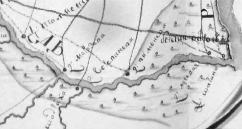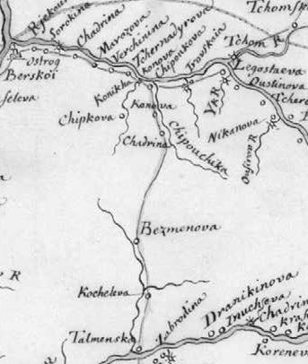 Фрагмент карты деревень в ведомстве Бердской земской избы 1771 г. Большая часть бывших жителей деревни Черепановой, включая Кашниковых и Дарью Михайловну, действительно обнаруживается в деревне Койновой. Там же мы находим ранее переселившегося туда сына основателя деревни Федора Никифоровича Черепанова. О том, что он когда-то жил в деревне Черепановой, свидетельствуют следующие записи: жена его сына Петра взята « в деревне Черепановой у Федора Шелыгина» [17. Л. 96 об]; Петр, сын Василия Ивановича Завьялова, переселенца из деревни Морозовой, взял в жены Параскеву, дочь Федора Черепанова из той же деревни, что и брат его Борис, взявший в жены Ирину, дочь крестьянина Василия Кашникова из деревни Черепановой [17. Л. 102]. По нашим предположениям, отец Федора Черепанова Никифор Фадеевич переселился на шадринскую пустошь в канун 1751 г. До этого он, включая период 2-й ревизии, проживал в деревне Детлевой, где в 1721 г. был впервые переписан в числе прибывших его отец - Фадей Емельянов сын Черепанов, уроженец г. Соликамска [10. Л. 393]. Таким образом, получается, что деревня Шадрина исчезла не сразу, а около двадцати лет существовала с новым составом жителей и под новым названием - Черепанова. От старой деревни остались частично избы, пашни и ...«женский след» в лице выданной замуж в соседнее село дочери Михаила Трофимовича Шадрина, вернувшейся впоследствии с семьей обратно (вполне вероятно, в родовую опустевшую избу). Этот «след» сшивает старое название с новым и является лишним доказательством расположения ревизской деревни Щедриной на Берди, рядом с деревней Морозовой. Шадрина на Шипунихе Теперь обратимся ко второй Шадриной и ее архивной истории. В краеведческой литературе существуют две версии появления деревни Шадриной на реке Шипунихе. Первая, уже упомянутая выше версия искитимского краеведа А.И. Оборкина, отождествляет Шадрину на Шипунихе с ревизской деревней Щедриной и датирует ее появление в диапазоне с 1702 по 1708 гг. [39] Вторая, высказанная в свое время новосибирским историком Н.А. Миненко, переносит создание деревни на вторую половину XVIII века: «В 17641765 годах, также по личной инициативе крестьян, в ведомстве Бердского острога были основаны деревни Шадрина и Евсина» [38, с. 56]. Версия Н.А. Миненко базируется, по всей видимости, на не совсем корректной записи в 4-й ревизии: «оная заведена переехавшими в 1764 году Берского острогу из нижеписанной деревни собой» [17. Л. 239]. И далее переписчик дает перечень переселенцев в Шадрину из соседней Шипковой, игнорируя тот факт, что один двор (крестьян Ремезовых) был обустроен там задолго до указанного года. Толчком к прояснению примерного времени создания деревни стало ознакомление с одной из ранних карт Приобья, созданной геодезистом Петром Чичаговым. В 17211725 гг. П. Чичагов занимался картированием Средней и Нижней Оби и Нижнего Тобола; на 1725-1726 гг. приходится сбор материала по Верхнему Приобью, следом состоялась экспедиция на Енисей, закончившаяся в 1730 г. Созданная по результатам этих экспедиций карта Обского и Енисейского бассейнов была вывезена во Францию в 1747 г. французским ученым Ж.Н. Дедилем и надолго выпала из научного оборота. В настоящий момент карта доступна в он-лайн просмотре на сайте Французской национальной библиотеки [26]. В ведомстве Бердского острога на карте П. Чичагова оказались отражены сразу две Ша
