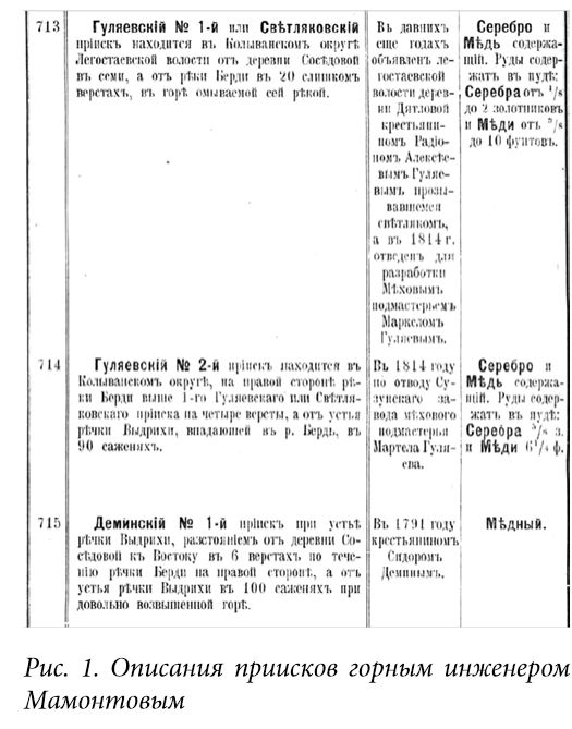 ![]() СТЕПАНОВ Игорь Виленинович. Забытая история: Медные прииски юго-востока Новосибирской областиСТЕПАНОВ Игорь г. Новосибирск, Россия ЗАБЫТАЯ ИСТОРИЯ: МЕДНЫЕ ПРИИСКИ ЮГО-ВОСТОКА НОВОСИБИРСКОЙ ОБЛАСТИ Аннотация: В статье излагаются результаты архивных и полевых исследований полиметаллических медно-серебряных приисков XVIII-XIX веков, находившихся на территории современных Искитимского и Маслянинского районов Новосибирской области. Предполагается, что обнаруженные прииски станут частью историко-культурного наследия региона и достойными туристическими объектами. Ключевые слова: Новосибирская область, история, геология, месторождения, прииски, рудники В истории открытия и промышленной эксплуатации медно-серебряных месторождений южной части Западной Сибири XVIII-XIX веков преимущественное внимание уделяется рудникам, расположенным на территории современного Алтайского края. Это справедливо с точки зрения их вклада в обеспечение сырьем Колывано-Воскресенских заводов. Однако география разведки и открытий полиметаллических проявлений гораздо шире – она охватывает и юго-восточные районы современной Новосибирской области. Медные руды были обнаружены на территории Западной Сибири в первой четверти XVIII века. В работе А. Малеева [1, с. 9-14] говорится о том, что в мае 1720 года томскими жителями Степаном Костылевым и Федором Комаровым были найдены медные руды «в томском урочище». В результате исследования образцов этих руд было определено, что содержание в них чистой меди составляет «одна треть по весу». В следующем, 1721 году, сибирские рудоискатели обнаружили медную руду на реке Алей – левом притоке реки Обь, протекающем на территории современного Алтайского края. А в 1725 году сыном Степана Костылева Яковом с «товарищем, беломестным Леонтием Останиных», было заявлено о медных рудах «в Змеевой горе». В этом же году по указанию Акинфея Демидова начато строительство первого медеплавильного завода вблизи озера Колыванского. Сырьем для завода стали руды, открытые по «старинным чудским выработкам бронзового века» уральскими рудознатцами, посланниками А. Демидова – братьями Леонтием и Андреем Кабновыми, и Матвеем Кудрявцевым [2, с. 328]. В 1726 году, с первой плавки руды и выдачи А. Демидову от Берг-Коллегии «привилегии» на разработку алтайских рудных месторождений, началась история Демидовских, а после – Кабинетских Его (Ее) Императорского Величества Колывано-Воскресенских заводов, к которым в 1766 году присоединился и Сузунский завод. По данным горного инженера В. Мамонтова [3], в начале XIX века на землях Алтайского горного округа, состоявших из территорий современных регионов – Алтайского края, Новосибирской, Кемеровской, Томской областей, Республик Алтай и Хакасия, а также Восточно-Казахстанской области Республики Казахстан, – насчитывалось 802 полиметаллических (исключая золотые) рудных месторождения. В волостях Кузнецкого уезда указаны места пяти приисков, находящихся в настоящее время в границах Новосибирской области. В Барнаульском уезде, также включавшем в себя территории современной НСО, отмечено 25 приисков и рудников, большей частью расположенных в пределах сегодняшних Искитимского, Маслянинского и Сузунского районов [3, с. 414-427]. Их основная часть размещалась на прибрежных склонах реки Бердь Легостаевской волости – от села