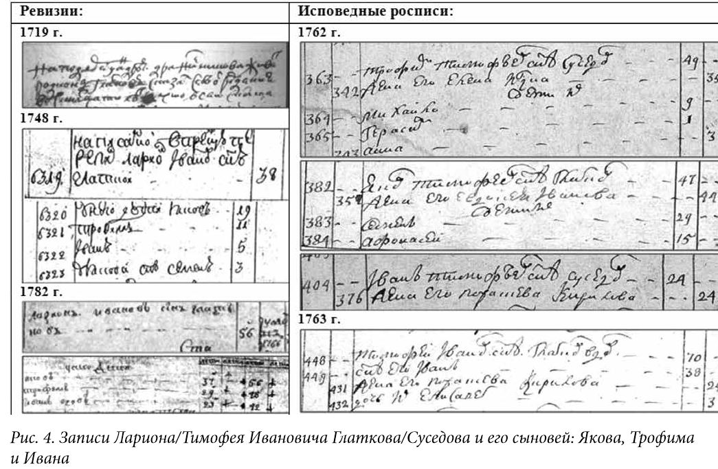 (1756 г.) [1] Как «Суседовы» братья будут появляться в исповедных ведомостях шесть лет подряд – с 1756 по 1762 гг., но потом фамилия исчезнет из документооборота. Распутывание загадки непонятно откуда взявшейся и недолговечной фамилии длилось достаточно долго. Поначалу предполагалось, что это прозвищная «говорящая» фамилия (например, усыновленные дети соседа), либо остаток семьи, мигрировавшей южнее, на Алтай (пытались найти связь с еще одними Суседовыми на территории региона – драгунами в Катунской крепости). По спискам 1-2-4-й ревизий в д. Детлевой не было ни одного Тимофея, годящегося в отцы этим двум братьям. Помогло сопоставление целого ряда источников. В описях церковных приходов 1751 г. обнаружилось, что Тимофей все-таки в д. Детлевой был, но записанный под фамилией Глатков [18, Л. 133]. А далее, потянув за эту ниточку, вышли на очередной феномен двойных имен, регулярно проявляющийся в легостаевской округе. С архаичной практикой двойных христианских имен, фиксируемой в письменных источниках до XVII века [59, с. 18-19], исследователи и генеалоги-практики сталкиваются, как правило, в старообрядческих регионах. Старообрядцы не придерживались постулата о максимальных семи днях, разделяющих рождение и крещение. Значительный разрыв в событиях влек за собой появление двух имен, привязанных как к рождению, так и к крещению. Отмечают этот факт и ономасиологи: «Обычай еще до крещения давать младенцу христианское имя долгое время сохраняется в старообрядческой среде. Пока это явление мало изучено» [57, с. 61]. Найденный в церковных списках 1751 г. и росписях середины 60-х гг. Тимофей Иванович Глатков оказался идентичным «ревизионному» Лариону Ивановичу Глаткову. В составе семьи Лариона/Тимофея Глаткова три сына – старший Яков, рано отделившийся в самостоятельное домохозяйство, и младшие Трофим и Иван. Именно Трофим и Иван были какой-то период записаны как Суседовы, но потом снова превратились в Глатковых. Предположение о неофициальной принадлежности к старообрядческому толку Тимофея/Лариона основывается на полном отсутствии как его самого, так и его жены в ведомостях Михаило-Архангельской церкви с середины 50-х (т.е. с начала ее функционирования) до начала 60-х годов. И только в 1763 г. Тимофей Иванович, будучи вдовцом, записывается как прихожанин д. Детлево, в семье сына Ивана [24, Л. 369]. Далее отмечается каждый год, вплоть до своей смерти, т.е. до 1766 года. По всей видимости, бывший раскольник, примирившись с официальной Церковью, стал участвовать в Таинстве Причастия. Совместное проживание младших сыновей с Тимофеем Ивановичем, зафиксированное в описях 1751 г. и ведомостях 60-х гг., позволяют предположить, что Суседовы – вторая фамилия всего семейства, а не только детей. На Рис. 4 представлены фрагменты документов, подтверждающие идентичность Лариона-Тимофея, а также Трофима и Ивана, записанных то Суседовыми, то Глатковыми. Рисунок 4. Записи Лариона/Тимофея Ивановича Глаткова/Суседова и его сыновей: Якова, Трофима и Ивана Ревизии: 1719 г. На подворье у Андрея Драничникова живет Родион Глатков. Сказал себе от рождения 18 лет [9, Л. 254 об.]. 1748. Написанной в прежнюю перепись Ларион Иванов сын Глаткой 38. После переписи рожденные у него дети Яков 19 Трофим 11 Иван 5. У Якова сын Семен 3 [11, Л. 151 об.-152]. 1782. Ларион Иванов сын Глатков. 56 в 1763 г., умре в 1766 году. У него дети Яков 56, Трофим 48, Иван вд