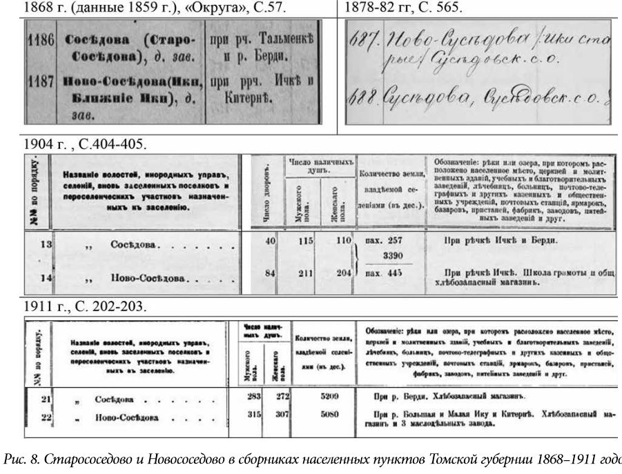В таблице перечислены фамилии вплоть до конца XIX века. Три базовых фамилии – Лямкин, Легостаев, Архипов – остаются неизменными, в разные периоды к ним добавятся переселенцы из Соседовой (Лиханов, Ушаков, Гусельников), д. Ировской (Урванцев), Легостаевой (Коновалов, Бердюгин). Время от времени в деревне будут появляться жители окрестных деревень, кто-то приживется, кто-то съедет. Совместная история Старососедовой и Новососедовой Внешне все выглядело так, что на рубеже XVIII и XIX веков одной семье – Лихановым – удалось, переехав из Суседовой, перенести на новое место привычное название, добавив приставку «ново». Но, может быть, человеческий фактор в данном случае преувеличен. Не меньшую роль сыграли хозяйственные и административные связи двух деревень, синхронизировавшие, в итоге, их названия. Сельское самоуправление существовало в Сибири со второй половины XVIII века и держалось на сельской общине, которую здесь предпочитали называть «обчеством», а не «миром», как в центральной России [58, С. 53]. В ходе реформы управления государственными крестьянами 1838 г. вся Россия перешла на «сельские общества» – первичные звенья в рамках волостных образований. Общества совпадали с территориальной единицей, только если она была крупной. Поскольку в Легостаевской волости преобладали небольшие деревни, объединение нескольких деревень в рамках одного сельского общества было заурядным явлением. Например, на лето 1882 г. Легостаевская волость состояла из 28 селений и 14 сельских обществ [60, Л. 119]. Вновь возрожденную Иковскую-Новососедову с самого начала объединили с д. Соседовой по причине их территориальной близости. Длительное существование (практически на протяжении века) в административно-хозяйственном симбиозе не могло остаться без последствий. Отразилось оно и на закреплении однокоренных названий деревень с разными приставками, и на формировании фамильно-смешанного состава жителей. На Рис. 8 представлены фрагменты фиксации деревень Соседовой (Старосоедовой) и Новососедовой в сборниках населенных пунктов Томской губернии (1866–1911 гг.). Вплоть до 1911 г. деревни записываются рядом, в устоявшейся последовательности (сначала Соседова, затем Новососедова); до 1904 г. отмечается либо объединяющее их сельское общество, либо общее землепользование. Рисунок 8. Старососедово и Новососедово в сборниках населенных пунктов Томской губернии 1868 –1911 годов [5]