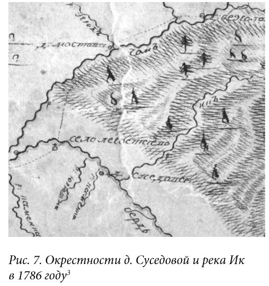 История Новососедовой, с одной стороны, проще, поскольку не надо разгадывать происхождение фамильного названия, с другой – прерывистая, с некоторыми затемнениями на разных этапах. Заселение северного берега Берди началось позднее, чем южного, и происходило силами томских крестьян, так как территория относилась к Томскому уезду. Самое раннее упоминание о поселении мы находим у Г.Ф. Миллера, в его описании Томского уезда на момент октября 1734 г. В списке деревень, относящихся к Сосновскому ведомству, в разделе «По Ине и впадающим в нее маленьким речкам» под номером 19 стоит «Иковская, на рч. Ик, которая впадает в Иню с севера, немного ниже предыдущей деревни» [62, с. 93]. Если абстрагироваться от хронической путаницы с рекой Иней, наблюдаемой у Миллера, то можно констатировать, что деревня Иковская на речке Ик существовала как минимум с начала 30-х гг. XVIII века. Второе раннее свидетельство о существовании Иковской – ландкарта Шишкова 1736 г. (Рис. 2). На ней четко прописано географическое положение деревни – у места слияния Большого и Малого Ика. В списках первой ревизии 1720 г. Томского уезда деревня Иковская отсутствует. Но уже во второй ревизии зафиксированы и д. Иковская и соседняя с ней д. Чемская на р. Чем. Как видим, к середине XVIII века заселение земель Томского ведомства придвинулось вплотную к границам Бердского острога. В 1748 г. в д. Иковской Сосновского ведомства Томского уезда был переписан один крестьянский двор Богдановых, всего пять человек мужского полу [12, Л. 741]. При этом отмечалось, что переписаны Богдановы были в прежнюю перепись, т.е. скорее всего в последующих после в 1720 г. пополнительных списках. Проживали они на тот момент в Иковской или в какой-либо другой деревне, неизвестно. Если проживали, то время образования Иковской может быть лет на пять-десять раньше, чем упоминание у Г.Ф. Миллера. Но, для углубления истории деревни, в силу неопределенности события, нужно найти иные подтверждающие документы. Рисунок 6. Первое сохранившееся упоминание о д. Иковской в статистических источниках – 2-й ревизии В 3-ю ревизию 1763 г. Иковская переписывается с тем же, но опустевшим двором. Хозяин семейства Михаил Акинфиевич, а также старший сын Кирилл, умирают один за другим (в 1752 и 1754 гг.), а младший Василей с племянниками переезжает «сам собой» в деревню Красилову Белоярского ведомства [13, Л. 489 об.]. Когда опустела деревня – неизвестно, поскольку не указана дата переезда Василия. Примерный разброс времени отъезда последних жителей – с 1754 по 1763 годы. Как минимум на двадцать лет деревня превращается в пустошь. Подтверждают отсутствие на тот период какого-либо населенного пункта на реке Ик и церковные документы. В исповедных росписях 1786 г. Михаило-Архангельской церкви из ближайших к д. Соседовой деревень на другой стороне Берди представлены только Мостовая и Каменка [28. Лл. 818-854]. Также об этом красноречиво свидетельствует Генеральная карта Колыванской губернии 1786 года, на которой отражены д. Суседова и река Ик в девственных лесах, не отягощенная человеческим присутствием. Рисунок 7. Окрестности д. Суседовой и река Ик в 1786 году [3]