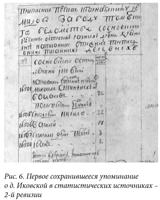 Мы разместили этот фрагмент карты еще и потому, что он рубежный, и отражает практически последние моменты небытия старой Иковской. Буквально год спустя эти места начнут обживаться заново, уже в границах Бердского ведомства и бердскими крестьянами. В исповедных ведомостях легостаевского прихода 1788 г. появляется деревня «Вновь Иковская» [29, Л. 926], т.е. стартует новый этап существования возродившейся деревни. «Вновь Иковской» деревня будет называться только на первых порах, далее по-прежнему будет использоваться старое название без какой-либо приставки. В возрожденную деревню переселяются три семьи из д. Легостаевой. У всех переселенцев-легостаевцев в старом селе оставались братья, что говорило о том, что основной причиной переезда была теснота и нехватка земель. Рассмотрим подробно их истории. Иван Агафонович, основатель рода бердских Лямкиных, записан в ландратскую и ревизионную перепись 1719 г. в д. Барабинской как «Ласкин» [8, Л.189; 9, Л. 202], аналогично записаны его младшие братья, Яков и Леонтий, учтенные в дополнительных списках 1721 г. [10, Л. 364]. В Беляковской слободе, откуда «по сказке» прибыли Иван и его братья, действительно проживали Ласкины [6. Лл. 50-52]. Во вторую ревизию 1748 г. все три брата будут писаться уже как «Лямкины» [11, Л. 152-152 об.]. Может быть, сказалось «кривое» написание либо прочтение, может быть изначально было два варианта фамилии, и, в конечном итоге, утвердился второй. Переселенец в д. Иковскую Афанасей Васильев Лямкин приходился внуком Ивану Агафоновичу. На момент переезда в Иковскую у него было пятеро сыновей, старшие из которых успели обзавестись своими семьями. Двор состоял из 10 человек. В 1712 г. в Бердском остроге поселились уроженцы той же Беляковской слободы, пашенные крестьяне братья Легостаевы. На уральской родине они проживали под совершенно другой фамилией – как «Костины» [6, Л. 92]. Скорее всего, это была не фамилия, а «дедчество», подсказка потомкам о предыдущем колене. В крестьянской книге 1704 г. переписан весь состав семьи: « Тимофей Федоров сын Костиных у него дети Семен Федор Яков Леонтей Василей у Семена сын Семен ж пашут десятинной пашни полдесятины и полчети десятины Федор взят в салдаты » [5, Л. 616]. На новом месте, в д. Барабинской, образовалось два двора, уже Легостаевых: старшего брата Семена Тимофеевича и младших братьев Якова, Леонтия и Василия, а также проживавшего с ними престарелого отца Тимофея Федоровича [8, Л. 186 об., 189 об.]. В начале 20-х гг. они основали неподалеку от д. Барабинской собственную именную деревню, которой суждено было стать волостным селом. В 30-х гг. большая часть семьи мигрировала в Белоярскую слободу и заложила одноименную д. Легостаеву (ныне село Володарка Топчихинского района Алтайского края) [54, с. 122]. Наиболее укорененной в бердскую землю оказалась линия старшего Семена Тимофеевича. Иван Васильевич Легостаев, переехавший в д. Иковскую, приходится внуком Семену Тимофеевичу. Переселился он в сорокалетнем возрасте, с четырьмя подрастающими детьми, из которых только Трифон достиг порога совершеннолетия. Двор новопоселенной семьи состоял из 6 человек. Петр Иванович Архипов отмечен только во второй ревизии, но как переписанный в предыдущую, значит, появился на бердской земле после 1722 г. [11, Л. 155 об.]. Отсутствие сказки и патронимичная фамилия, происходящая от отчества, либо «дедчества», не 