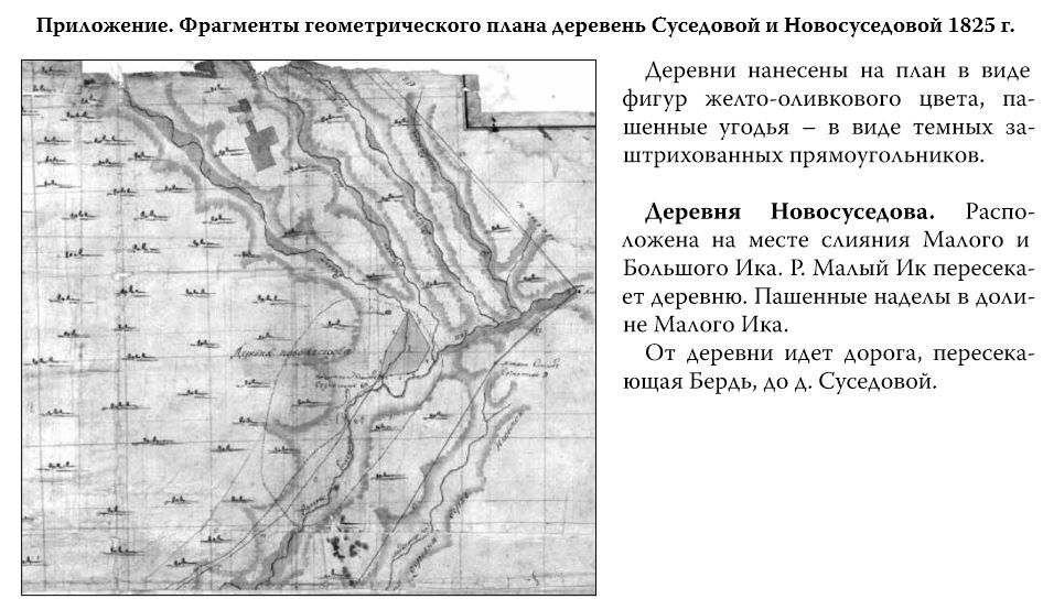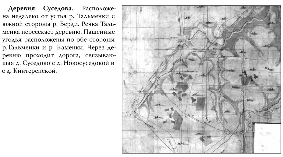 Деревни нанесены на план в виде фигур желто-оливкового цвета, пашенные угодья – в виде темных заштрихованных прямоугольников. Деревня Новосуседова. Расположена на месте слияния Малого и Большого Ика. Р. Малый Ик пересекает деревню. Пашенные наделы в долине Малого Ика. От деревни идет дорога, пересекающая Бердь, до д. Суседовой. Деревня Суседова. Расположена недалеко от устья р. Тальменки с южной стороны р. Берди. Речка Тальменка пересекает деревню. Пашенные угодья расположены по обе стороны р.Тальменки и р. Каменки. Через деревню проходит дорога, связывающая д. Суседово с д. Новосуседовой и с д. Кинтерепской. Список источников и литературы: 1. Territoire de Narim [Narym], Man gazéia, Tomsk , Eniséisk, Krasnoiar [Krasnoiarsk], Kouznetsk. Cette carte a été faite par le géodésiste Pierre Tchitchagov, 1721 // Национальная библиотека Франции. URL: http://gallica.bnf.fr/ark:/12148/btv1b55003151m/f3.item.zoom 2. Ландкарта Томского и Кузнецкого уездов геодезиста В. Шишкова 1736 г. // РГАДА. Ф.271. Оп.3. Д.140. 3. Генеральная карта Колыванской губернии 1786 г. // РГВИА. Ф. 846. Оп. 16. Д. 20252. 4. Геометрический специальный план Барнаульского уезда, Легостаевской волости, деревень Суседовой и Ново-Суседовой, 1825 г. // ГААК. Ф. 50. Оп. 2. Д. 125. 5. Крестьянские книги Тобольского уезда 1704 г. // РГАДА. Ф.214. Оп. 1. Д. 1406. 6. Перепись Тобольского уезда 1710 года.// РГАДА. Ф.214. Оп.1. Д.1524. 7. Роспись бердских служилых и оброчных людей, отправленных на строительство Белоярской крепости 1717 г. // РГАДА. Ф. 1134. Оп. 1. Д.7. 8. Ландратская перепись Кузнецкого уезда 1719 г. // РГАДА. Ф.350. Оп.1. Д.214. 9. Книга переписная Кузнецкого уезда 1719 г.// РГАДА. Ф.214. Оп.1. Д.1611. 10. Перепись прописных и пришлых Кузнецкого уезда 1721 г. // РГАДА. Ф.214. Оп.1. Д.1626. 11. Ревизские сказки Колывано-Воскресенского округа 1748 г. // ГААК. Ф.1. Оп.1. Д.28. 12. Книга переписная Томского уезда 1748 г. // РГАДА. Ф.350. Оп. 1. Д. 3579. 13. Сказки о государственных крестьянах Сосновского и Верхотомского острогов Томского уезда 1763-1764 гг. // РГАДА. Ф.350. Оп. 1. Д. 3582. 14. Именной список переписи населения Колыванской губернии 1782 г. // ГААК. Ф.169. Оп.1. Д.179. 15. Окладная книга о расположении на крестьян Легостаевской волости подушенных податей и прочих денежных сборов и заводских работ 1845 г. // ГААК. Ф. 10. Оп.1. Д.165. 16. Окладная книга о сборе с крестьян подушных податей, повинностей о исправлении заводских работ 1859 г. // ГААК. Ф.11. Оп.1. Д.36. 17. Дело о наборе рекрут, сыску и поимке беглых рекрут и разного звания людей 1724 г. / Бердская судная (земская) изба и волостное правление, Бердский острог и слобода. Сборник документов // РГАДА. Ф.1401. Оп.1. Д. 2. 18. Описи приписных крестьян Колывано-Воскресенского округа по церковным приходам 1751 г. // ГААК. Ф.1. Оп.1. Д.45. 19. ИР 1755 г. // ГАТО. Ф.263. Оп.1. Д.1. 20. ИР 1756 г. // ГАТО. Ф.263. Оп.1. Д. 2. 21. ИР 1759 г. // ГАТО. Ф.263. Оп.1. Д. 116. 22. ИР 1769 г. // ГАТО. Ф.263. Оп.1. Д. 13. 23. ИР 1762 г. // ГАТО. Ф.263. Оп.1. Д. 7. 24. ИР 1763 г. // ГАТО. Ф.263. Оп.1. Д. 8. 25. ИР 1765 г. // ГАТО. Ф.263. Оп.1. Д. 10. 26. ИР 1769 г. // ГАТО. Ф.263. Оп.1. Д. 13. 27. ИР 1783 г. // ГАТО. Ф.263. Оп.1. Д. 24. 28. ИР 1786 г. // ГАТО. Ф.263. Оп.1. Д. 29. 29. ИР 1788 г. // ГАТО. Ф.263. Оп.1. Д. 31. 30. ИР 1813 г. // ГАТО. Ф.263. Оп.1. Д. 80. 31. МК 1804, 1805 гг. // ГАТО. Ф.170. Оп.9. Д. 31. 32. МК 1806, 1807 гг. // ГАТО. Ф.170. Оп.9. Д. 33. 33. МК 1808, 1809 гг. // ГАТО. Ф.170. Оп.9. Д. 34. 34. МК 1810, 1811 гг. // ГАТО. Ф.173. Оп.1. Д. 133. 35. МК 1812, 1813 гг. // ГАТО. Ф.170. Оп.9. Д. 38. 36. МК 1819 г. // ГАТО. Ф.170. Оп.9. Д.44. 37. Метрическая книга Сретенской церкви Берского острога: 38. МК 1752 г. // ГАТО. Ф. 170. Оп. 10. Д78а. 39. Дело по доношению Кузнецкого духовного правления о священнике Осипе Арзамасове Архангельской церкви села Легостаевског