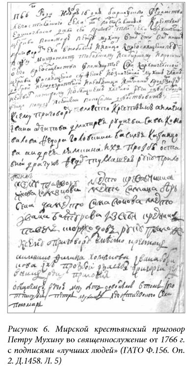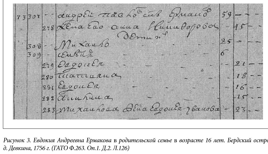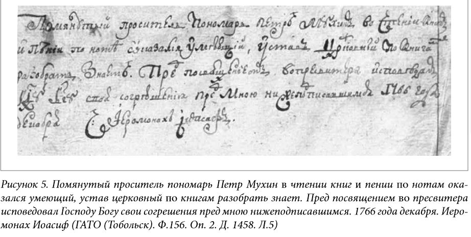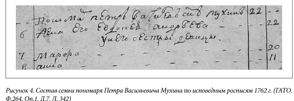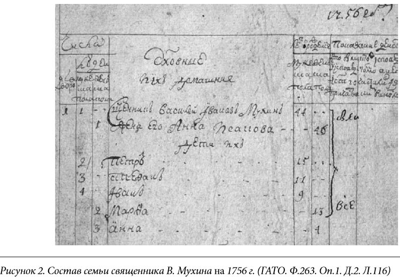 В Легостаевском Василий Иванович Мухин появился со всей своей многочисленной семьей. Было ему в момент приезда 42 года, жене его, Анне Исаковой,44 года. Пятеро детей (сыновья Петр, Стефан, Иван, дочери Мария и Марфа) родились еще в с. Балаирском, младшая Анна – либо в Красноярске, либо в Барнауле. Рисунок 2. Состав семьи священника В. Мухина на 1756 г. (ГАТО. Ф.263. Оп.1. Д.2. Л.116) Помимо напряженных церковных дел в разбросанном приходе и до конца не вставшей на ноги церкви, необходимо было заниматься и другими повседневными делами, неизбежными для сельской жизни. Например, покосами (на содержании была лошадь, без которой не добраться до отдаленных сел), сбором руги с крестьян (оклада не было, только «руга» – выделяемое крестьянами зерно, и доходы с треб). К каждодневным занятиям относилось также обучение детей чтению и письму, пению. Тобольская духовная семинария была заложена в 1743 г., и только после ее появления в епархии сформировалась традиция (она же обязанность) давать семинарское образование сыновьям – продолжателям службы. Подростковый возраст старшего Петра пришелся на первый этап формирования сибирского образования: открывшаяся семинария состояла только из низших классов. Получать начальные знания в сильной удаленности от дома было затратно и хлопотно, поэтому Петр предпочел обучаться у отца. В итоге, в 1759 г. Тобольская консистория взыщет с него штраф «за необучение» в пользу семинарии в размере одного рубля, но в том же 1759 г. в июле месяце он будет благополучно проэкзаменован, посвящен в стихарь и назначен на место пономаря Легостаевской церкви [31, Л. 5-5об.]. В августе 1759 г. в Барнауле, по ходатайству местного духовенства, которое в силу удаленности «находило для себя обременительным отправлять своих детей в Тобольскую семинарию», было открыто первое церковное учебное заведение в Приобье – латинская школа [41, с.74]. Основным назначением школы была подготовка к дальнейшему обучению в семинарии, а также к службе низшего духовенства (дьячков и пономарей). В 1759-1760 гг. в ней обучалось только 13 учеников [41, с.75]. Среди них – средний сын Василия Ивановича, Стефан. Чуть позже (в августе 1761 г.) в эту же школу поступил младший Иван. Все поступающие в латинскую школу должны были хорошо владеть старославянским языком. В этом плане домашнее обучение Мухиных не подвело. Но уклон в латинизацию начального образования, заложенный в пост-петровское время выпускниками Киевской духовной академии, пришелся не по душе двум братьям. В конце первого года обучения старший Стефан отчисляется из школы, поскольку «по апробации и латинской науке оказался непонятным» [29, Л.3]. В ноябре того же года в шестнадцатилетнем возрасте он посвящается в стихарь и получает грамоту на должность пономаря в Тальменской Михаило-Архангельской церкви [29, Л.5об.]. Младший, Иван, поступивший в школу в 1761 г., поначалу также не блистал в латыни (по справке учителя Омского, приложенной в деле отца [30, Л.16]), но в школе он продержится, правда, больше положенного срока. Скорее всего, школьный билет на двух-трехгодовую отсрочку из-за проблем с учебой был продлен еще на год. Появился он в приходе в 1765 г., когда ему исполнилось восемнадцать лет. В 1767 г. эксперимент с латинским обучением закончится, и, по распоряжению митрополита Тобольского и Сибирского Павла (Конюскевича), на месте латинских школ будут с