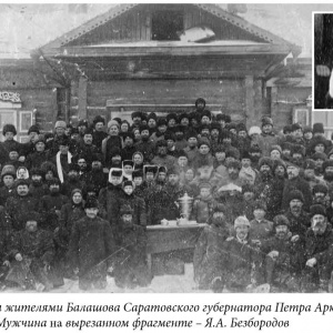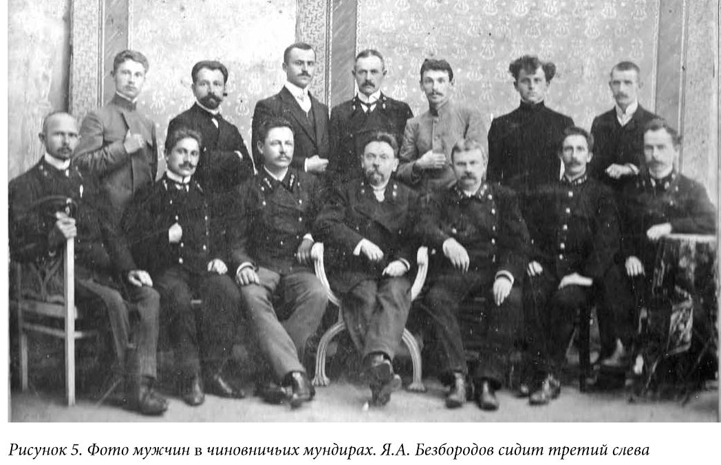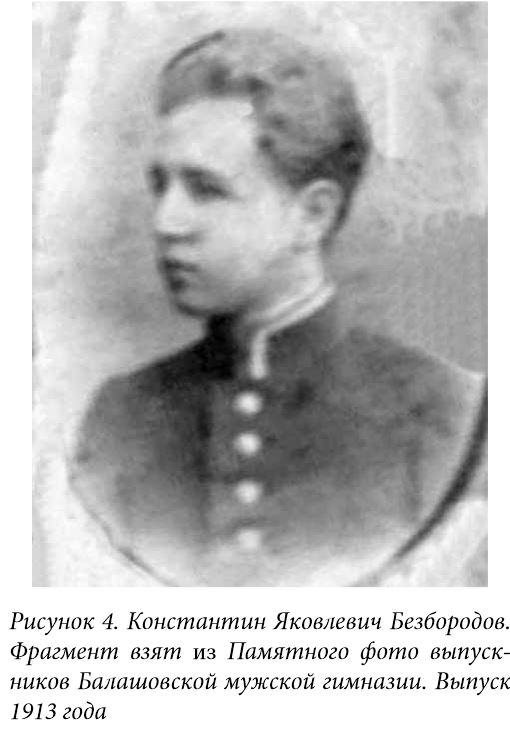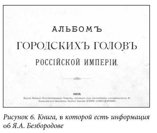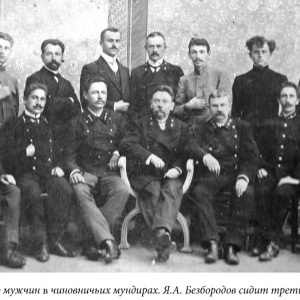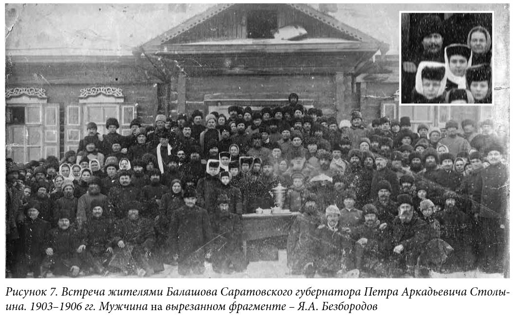 СПИСОК ИЛЛЮСТРАЦИЙ 1.Яков Алексеевич Безбородов. Фото не позднее 1903 года. 2.Фото мужчин в чиновничьих мундирах. Я.А. Безбородов сидит третий слева. 3.– 3.1. Встреча жителями Балашова Саратовского губернатора Петра Аркадьевича Столыина. 1903-1906 гг. Мужчина на вырезанном фрагменте – Я.А. Безбородов. 4.Памятное фото выпускников Балашовской мужской гимназии. Выпуск 1913 года. 5.Константин Яковлевич Безбородов. Фрагмент взят из Памятного фото выпускников Балашовской мужской гимназии. Выпуск 1913 года. 6.Дом Я.А. Безбородова в Балашове. Фото: В. Прозоров, 2023 г. 7.Конюшня возле дома Я.А. Безбородова в Балашове. Сейчас в помещении бывшей конюшни расположены жилые квартиры. Фото: В. Прозоров, 2023 г. 8.Дверь в доме Я.А. Безбородова в Балашове. Фото: В. Прозоров, 2023 г. 9.Книга, в которой есть информация о Торговом доме «Я. Безбородова, А. Семенова и Ко». 10.Рекламная листовка. 11.- 12. Лицевая и оборотная сторона рекламной листовки. 13. Книга, в которой есть информация об Я.А.Безбородове. 14. Образец подписи Я.А. Безбородова. ГАСО. Ф. Б-46. Оп. 1. Д. 32. Л.12. "Живоносный Источник" №1 (28) за 2024 г.