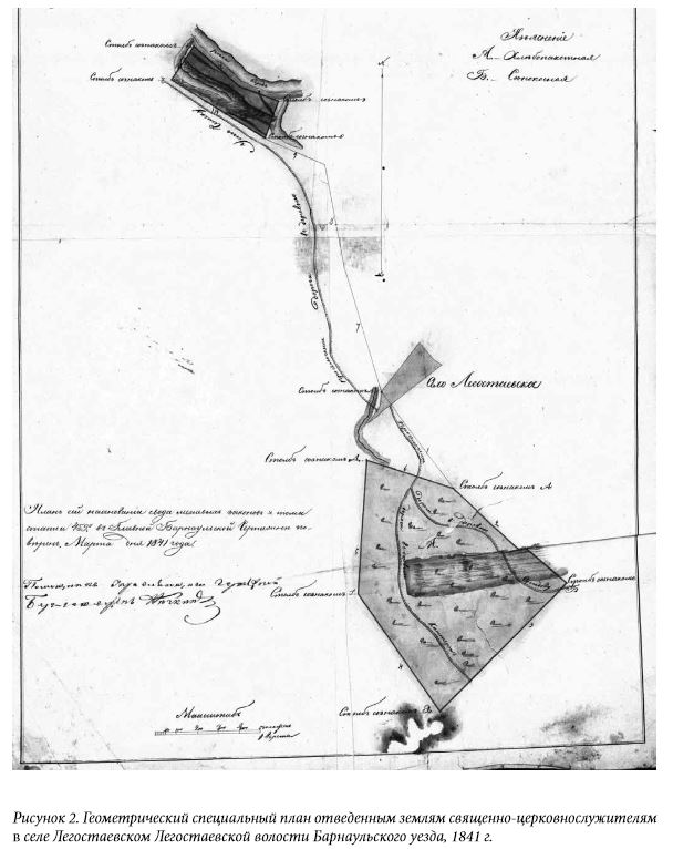 Источники: Дела ГАвТ Ф.156 «Тобольской духовной консистории» (Оп.2. Д. 1388; Оп.8. Д.1564; Оп.11 Д.144), Клировые ведомости 1870 и 1885 г., Томские епархиальные ведомости 1887-1911 гг.. Что касается выплат довольствия клиру, то они оставались неизменными вплоть до второй половины XIX века. В крестьянском приговоре 1766 г. священнику Петру Мухину со стороны крестьян было обещано «хлебной руги давать с каждого венца по пуду и сенными покосами довольствовать» [6, Л.4]. В клировых ведомостях 1855 г. прописано, что «на содержание священноцерковнослужителей денежного жалованья не получается, и довольствуются от прихожан дачею руги которой каждый священник по своей части получает с венца ржаным хлебом по одному пуду и причетники по полпуду с венца; диакон по 30 фунтов с каждого венца во всех приходах» [29, Л.39]. Первые серьезные подвижки в вопросе довольствия клира произошли в 1867 г, когда руга перестала собираться лично служителями с «каждого венца», т.е. двора, а стала выдаваться причту из хлебного запасного магазина, в свою очередь заполняемого крестьянами. Согласно распоряжению для причтов Западной Сибири 1867 г . 9 ноября №109 «священник получает из запасов хлебного магазина 350 пудов, каждый псаломщик по 125 пудов хлеба» [33, Л. 51]. В 1898 - 1902 гг. содержание от прихожан легостаевского причта составило 675 пудов на весь штат из трех человек [38, Л.267, 39, Л.277]. Отказ от крестьянской хлебной руги для духовенства в легостаевском приходе происходит к концу первого десятилетия XX века. В справочнике Томской епархии 1910 г. впервые появляется информация о денежном довольствии: «содержание причта происходит на основе процентов с причтового капитала в размере 5 руб. 70 коп. и доходов от треб [40, Л.728). Причтовый капитал («церковные суммы») формировался из разных источников – от сдачи в аренду домов и земли до пожертвований «на помин души» от прихожан. Обращенный в ценные банковские бумаги или банковский вклад, он давал процент, позволяющий формировать базовый оклад священников и причетников. Легостаевская церковь достаточно поздно перешла на эту форму оплаты своих служащих (часть томских церквей практиковала ее еще с конца XIX века), и причиной было медленное накопление пресловутого причтового капитала. Помимо ружного довольствия крестьянская община делилась с церковью своими угодьями. В документах XVIII века упоминаются только сенокосные наделы. Первое найденное нами свидетельство выделения пахотной земли клиру Легостаевской церкви приходится на 1841 год. В Алтайском архиве хранится чертеж соответствующего землеотведения [20]. Архангельской церкви предоставлялось «хлебопахотной» земли 183 десятины 450 квадратных сажень, сенокосной – 36 десятины 300 квадратных сажень. Всего же удобной и неудобной было выделено 319 десятин 450 квадратных сажень. На неудобной – болотистые места, пашня, заросшая березовым лесом, кустарник, растущий по сенокосу. По этому плану основной пашенный надел располагался по дороге из села Легостаевского к деревне Усть-Чемской вдоль Берди, также часть пашни вклинивалась в сенокосные угодья на южном направлении, на развилке дорог, ведущих в деревни Новососедову и Кинтерепскую. «При отводе земли присутствовали Легостаевской Архангельской церкви священники Андрей Киселев и Игнатий Ковригин, диакон Иоанн Покровский. Понятыми были села Легостаевского: Григорий Лямкин, Фома Ар
