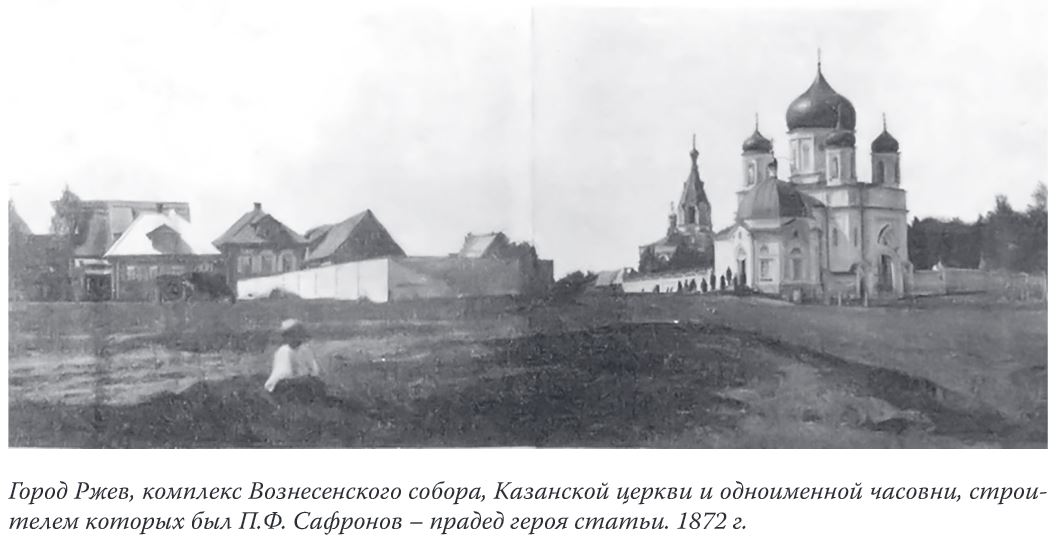 В 1892 году у ржевского купца 1-й гильдии Алексея Григорьевича Сафронова и его молодой жены Анны родился второй сын, при Крещении нареченный Григорием в честь святителя Григория Богослова. Семья, в которой мальчик появился на свет, принадлежала, выражаясь современным языком, к местной деловой и общественной элите. Сафроновы жили во Ржеве с XV века, по семейному преданию во времена Ивана Грозного их предок торговал пирожками вразнос. В XVII-XVIII столетиях представители этого рода числились в купеческом сословии, принадлежа, однако, к беднейшей его части. В ревизскую сказку 1816 года были внесены уже мещане Сафроновы - Федор и двое его малолетних сыновей - Павел и Иоанн. Пятьдесят лет спустя купец Иван Сафронов в числе наиболее уважаемых горожан, членов городского магистрата, подписывается под решением Ржевского городского общества об увековечивании памяти земляка – знаменитого изобретателя Терентия Волоскова, портрет которого установили в зале городских общественных собраний. Одной из самых замечательных личностей города Ржева суждено было стать Павлу Федоровичу Сафронову. Подобно многим ржевитянам, он ежегодно торговал на Нижегородской ярмарке, куда привозил товары, спускаясь по Волге на лодке и в одиночку преодолевая многие сотни километров. На ярмарке, продав привезенное добро, а также лодку, купец приобретал лошадь с телегой и возвращался домой уже с другими товарами. К сорока годам по своим капиталам, а главное – общественному авторитету Павел Федорович принадлежал к наиболее состоятельным предпринимателям Ржева, считавшегося в Тверской губернии вторым по богатству своих жителей после самой Твери. Вместе с тем, Ржев являлся крупным центром раскола, где не раз укрывались гонимые властями духовные лидеры старообрядчества. К старой вере принадлежало подавляющее большинство местных жителей. Члены семей купцов-старообрядцев составляли основу местного самоуправления, становясь гласными городской Думы и поочередно избирая городских голов из своей же среды. Общий настрой ржевских старообрядцев по отношению к официальной Церкви был агрессивно-нетерпимым, нередки были случаи дерзких выходок в отношении православных священнослужителей, от последствий которых богатые раскольники неизменно откупались. Переход в «никонианство» для любого горожанина был чреват общественным остракизмом, а для человека торгового еще и разрывом деловых контактов, Павел Федорович на сорок первом году жизни перешел в Православие. Этот шаг был сделан им под влиянием выдающегося миссионера и борца с расколом протоиерея Матфея Константиновского, который сегодня гораздо более известен в России как духовник писателя Н.В. Гоголя. Присланный во Ржев для противодействия расколу и увещевания отпавших от Церкви местных жителей отец Матфей нашел в образованном, начитанном и вдумчивом купце Сафронове сначала заинтересованного слушателя, а затем и духовного сына. По благословению протоиерея Констатниновского П.Ф. Сафронов принял на себя труд строителя, а затем и ктитора каменного Вознесенского собора, Казанской церкви и одноименной часовни на окраине города Ржева, на старом заброшенном кладбище, где с незапамятных времен стояла деревянная часовенка с Казанской иконой Богородицы, очень почитавшейся ржевитянами. По заказу Сафронова чертежи всех 
