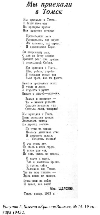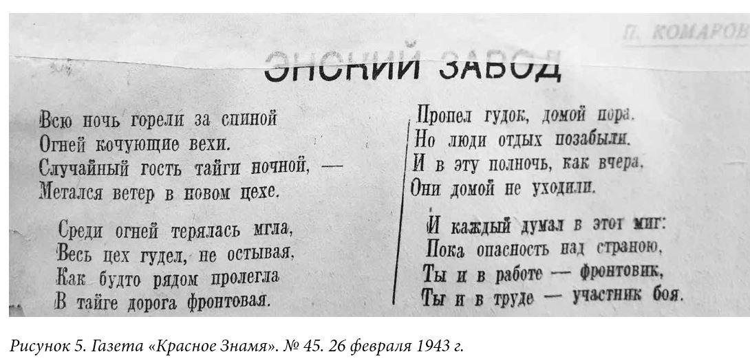 Рисунок 6. Газета «Красное Знамя». № 45. 26 февраля 1943 г. В 1944 году к 40-летию своего директора Н.А. Быкова рабочие завода № 653 подарили ему собственноручно сделанную поздравительную открытку. Автором стихотворения, написанного в ней, была Пая Хайцер, до Великой Отечественной войны работавшая в Ленинграде на заводе «Электросила», являвшаяся многолетним рабкором заводской газеты. После эвакуации в 1941 году П. Хайцер трудилась в Томске на заводе № 653, в том числе и руководителем одного из цехов. Привожу это стихотворение полностью: Вы помните, на днях был снег и дождь. Картошку мы копали длинными рядами И Вы – директор наш, наш вождь Копали рядом, вместе с нами. *** Вы знаете всех нас по именам И знаете все наши чувства и волненья, Позвольте же сегодня нам Поздравить Вас с днём Вашего рожденья. Мы любим Вас за то, что Вы просты И в трудную минуту рядом с нами, Вы – человек большой души, Мы верим Вам и мы гордимся Вами. Стихи не складны, мы ведь не поэты, Но пусть осудит их уж кто-нибудь другой, А Вы поверьте в искренность привета, Желаем Вам большого счастья, дорогой! [14] Открытка, с одной стороны, одна из наших семейных реликвий, а, с другой стороны, для историка, который не связан с нашей семьей, для которого она не несет особой личностной эмоциональной нагрузки, это очень интересный исторический источник по истории Великой Отечественной войны, по истории тыла, по истории психологии и поведения людей того времени. Действительно, из искренних шестнадцати поэтических строк можно многое узнать и о человеке, которому они посвящены – Н.А. Быкове, и об отношении к нему людей, и о неких тенденциях той эпохи. На открытке указана дата рождения Н.А. Быкова по старому стилю. В стихотворении Николай Андрианович предстает как искренний человек, внимательный к нуждам работников завода. По оценкам исследователей, в нем сочетались жесткость, требовательность подхода со стремлением оказать заботу людям. Видно, что он не пренебрегал и самой простой работой. Так, будучи директором завода, вместе со всеми в непогоду копал картошку. За этим стоит психология поведения советского человека в трудные годы войны. Простота, непритязательность и преданность делу были свойственны человеку военного времени, в том числе и находящемуся на руководящих постах. Николай Андрианович характеризуется как надёжный человек, на которого можно положиться в сложной ситуации. С другой стороны, в этих строках видна и психология восприятия руководителя его подчинёнными: «Директор наш – наш вождь». Очевидна особость восприятия руководителя (вождь), его несхожесть с современным понятием о менеджере как управленце и искусственно создаваемом во время тренингов корпоративном духе. Дух взаимоотношений создавался исподволь в процессе повседневной жизни. Видно, что подчиненные ценили в своем руководителе душевные качества. Их восприятие выходило за рамки узко должностных, безличных: они пишут своему директору, что любят его, в обращении используют слово «дорогой», желают ему «большого счастья». Характерен и внешний вид подарка. Он выполнен на простой плотной бумаге, сейчас уже немного пожелтевшей. Поражает аккуратность прорисовки мельчайших деталей рисунка, стройность и каллиграфичность написания текста. За этим стоит способность человека военного времени к творчеству, к обращению к пр