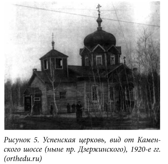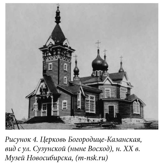 В 1920-е гг. эта церковь, как и многие другие, перешла к обновленцам. 20 марта 1938 г. она была закрыта и переоборудована под зернохранилище. С 1950-х гг. в ней находился кинотеатр «Октябрь». В связи с ветхостью он был закрыт и передан военным, а в 1983 г. здание было снесено. Это здание хорошо просматривается на космическом фотоснимке 1965 г. В настоящее время на месте бывшей Богородице-Казанской церкви располагается автостоянка перед бизнес-центром (ул. Восход, 14/1). 4. Церковь Успенская (Новокладбищенская) - православный участок нового городского кладбища. Молитвенный дом с престолом во имя Успения Божией Матери был выстроен в 1912 г. при заимке приюта «Ясли». В 1920 г. умирает Председатель Совета приюта отец Диомид (Чернявский), и над его могилой на Новом кладбище строят часовню, которая стала так и называться «Диомидовской». Настоятелем её был отец Илия (Копылов). В 1924 г. вместо часовни был возведён и освящен первым епископом Ново-Николаевским Никифором (Асташевским) деревянный храм в честь Успения Пресвятой Богородицы. При нем позднее был похоронен и он сам, и несколько других священнослужителей.