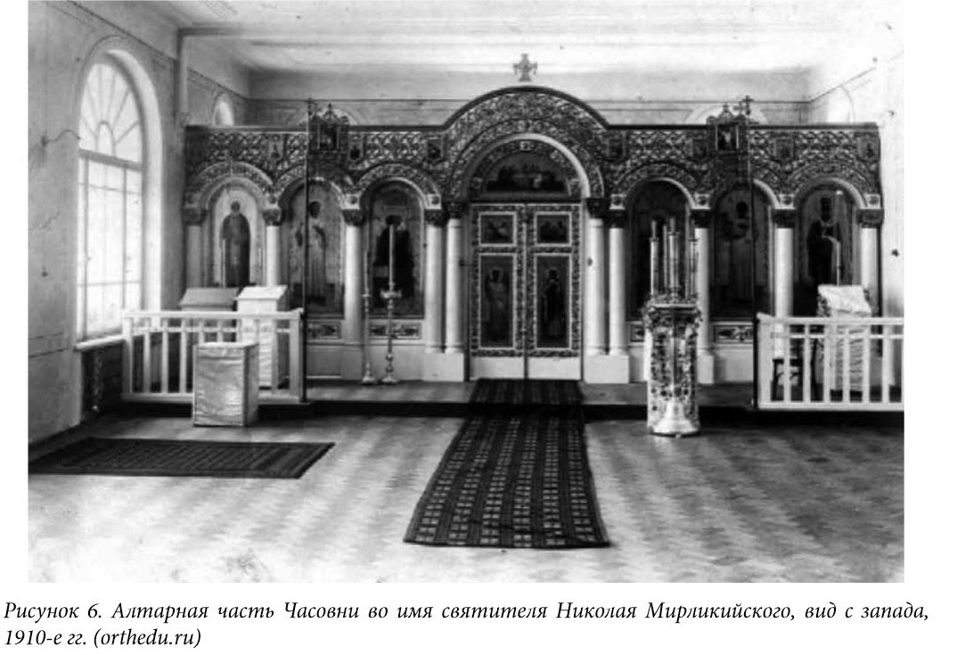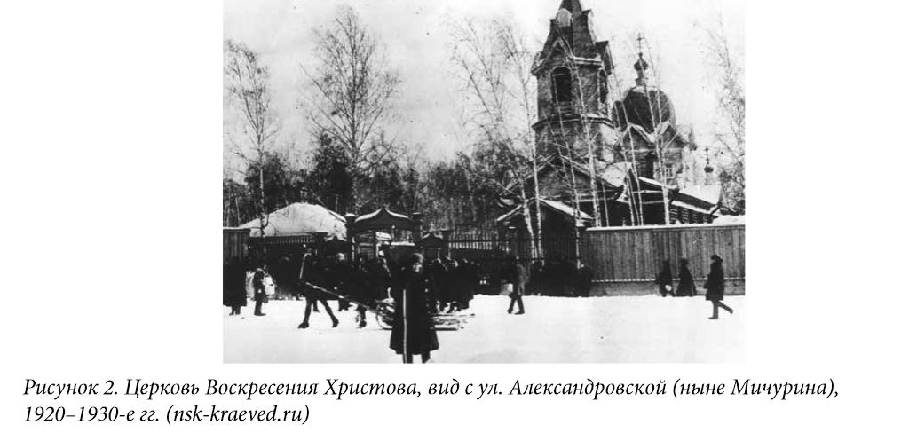 В 1937 г. иерей Илия (Копылов) и другие служители были репрессированы, но сама Успенская церковь вплоть до 1944 г. была единственным в городе действующем культовым сооружением. В 1943 г. Успенский храм ненадолго стал кафедральным – здесь до открытия Вознесенского собора служил митрополит Варфоломей (Городцов). В 1962 г. властями было принято решение о ликвидации церкви. Предполагалось перенести ее к Заельцовскому кладбищу, но летом 1963 г. здание снесли. Останки митрополита Никифора и диакона Георгия Никифорова были перенесены на Заельцовское кладбище. Вся утварь, иконы и имущество ликвидированной церкви были переданы в Вознесенский собор. В настоящее время на месте церкви Воскресения Христова находится зеленая зона парка культуры и отдыха «Берёзовая роща», развилка дорожек при входе в парк со стороны КЦ «Сибирь-Концерт» (ДК «Строитель»). 5. Часовня во имя святителя Николая Мирликийского располагалась в здании реального училища, получившего в 1913 г. имя Дома Романовых. Оно было построено в 1912 г. на Старобазарной площади по проекту архитектора А.Д. Крячкова. В северной части здания имелся большой зал, который служил и столовой, и театром, и гимнастическим залом, и часовней св. Николая, где проходили молебны учащихся. Чтобы обозначить место храма с внешней стороны здания, на крыше ризалита был установлен крупный каменный крест.