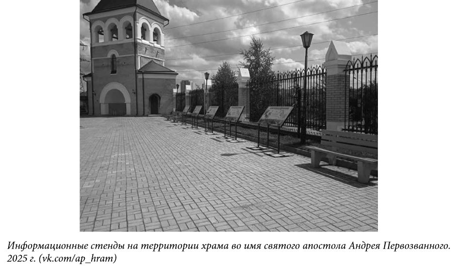 Инициативная группа обсуждала разные варианты памятного знака (от крестов до объёмных уменьшенных копий-макетов), но остановились на скромном и недорогом: отдельно стоящих информационных, антивандальных стендах высотой 1,2–1,3 м, размером плоскости 2 х 1 м, с наклоном в 45 ° для удобства просмотра и защиты от снежных заносов. К размещению информации на стендах были предложены основные вехи истории церкви, максимальный иллюстративный материал (фрагмент карты, фотографии храма, его первых служителей, при их отсутствии – изображение посвящённого святого), а также ссылка на QR-код для перехода на сайт с расширенной информацией. Данный пакет вместе с предлагаемым эскизом информационного стенда был передан о. Виктором на рассмотрение и благословение в Новосибирскую епархию. Протоиерей Вячеслав (Шуберт), настоятель храма во имя святого апостола Андрея Первозванного, нашёл возможность финансирования проекта. В рамках краеведческого проекта «К истокам святынь» он изготовил и установил стенды по некоторым из рассматриваемых храмов на территории храма Андрея Первозванного в Снегирях на ул. Тюленина. Несмотря на то, что основная идея проекта – информирование большинства простых людей, жителей нашего города, а не только прихожан одной церкви о местоположении утраченных храмов – пока полностью не осуществлена, есть надежда, что это благое начинание будет продолжено, и памятные информационные стенды займут свои места на своих собственных локациях, где их по-прежнему ждет ангел разрушенного храма. Завершить статью хотелось бы следующими словами о. Виктора: «Если мы хотим, чтобы наши дети и внуки действительно выросли патриотами своей Родины, продолжателями православных традиций нашего народа, любили и были готовы защищать отчизну, мы должны сохранить и передать им память о всех святынях, дорогих каждому православному новосибирцу». Литература: 1. Государственный архив Алтайского края (ГААК). Ф. 4. Оп. 1. Д. 2312. 2. Государственный архив Новосибирской области (ГАНО). Ф. Д-156. Оп. 1. Д. 2762. 3. ГАНО. Ф. Д-159. Оп. 1. Д. 10. 4. ГАНО. Ф. Д-159. Оп. 1. Д. 64. 5. ГАНО. Ф. Д-970. Оп. 1.Д. 66. 6. Ст. Обь // Вестник сибирской железной дороги. 1903. № 39. 25 сентября. 7. Томские епархиальные ведомости. 1899. № 22. «Живоносный Источник» №3 (33) за 2025 год