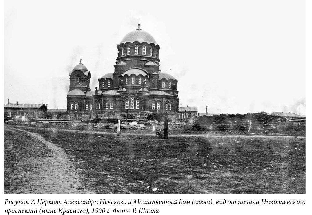 Решено было построить на правом берегу и молитвенный дом. Деревянный храм с небольшой колокольней строился на пожертвования поселян и 24 ноября 1895 г. был освящен колыванским священником Константином (Львовым) также в честь Александра Невского. Первым его служителем стал священник Каменского прихода Василий (Посельский) [4, л. 8об]. Строительство каменного храма началось рядом, на возвышенности, чтобы «хорошо видны и река, и железная дорога» [1, л. 1, 1об]. После завершения строительства и освящения деревянный молитвенный дом по решению епархиального начальства был разобран и перенесен на участок церковно-приходской школы (уч. № 9-12 квартала № 28 Центральной части) [3, л. 23], став началом Покровской церкви. Описания и сохранившиеся фотографии показывают, что сегодня на месте молитвенного дома проходит автомобильная дорога ул. Советской между собором Александра Невского и пригородным терминалом станции «Правая Обь» (Красный проспект, 1а и Красный проспект, 1а. к.3).