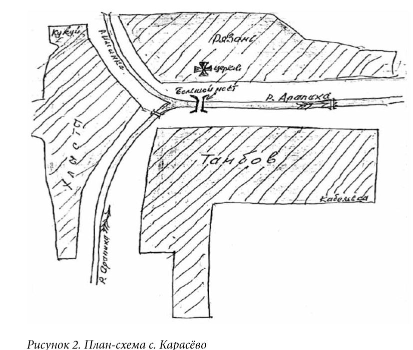 ![]() ДАНИЛОВ Г.И. ВоспоминанияВОСПОМИНАНИЯ Данилов Г.И., сибиряк, уроженец села Карасева Новосибирской области Аннотация. Житель г. Бердска Алексей Николаевич Осадчий поделился с редакцией текстами рукописей своего предка Григория Ивановича Данилова (1919–16.03.1997), родного брата его деда. Он оставил после себя семь тетрадей, составленных в 1992–1995 гг. Текст написан грамотно, хорошим почерком и местами прекрасно проиллюстрирован. Григорий Иванович Данилов родился в большом селе Карасево, ныне Черепановского района Новосибирской области. Он окончил Томский топографический техникум и впоследствии работал в Восточно-Казахстанской области заместителем директора Серебрянского завода неорганических производств. В 1997 г. он умер и был похоронен в г. Пушкин Ленинградской области. Село Карасёво по официальным данным было основано в 1776 г. в славный век правления Екатерины Великой. И хотя свои тетради Григорий Иванович называет воспоминаниями, начинается его повествование задолго до рождения автора, в далеком 1892 г., когда его дед по отцу Прокопий Данилов переехал в Сибирь из Тамбовской губернии. Записаны они им из сохранившихся в памяти рассказов и воспоминаний его старших родственников, и на основе записок его отца. «Все, что помню…» – такой он выбрал эпиграф для своих историй. В них мы сможем прочесть о жизни сибирского села, о людях, об особенностях крестьянского и купеческого труда, уклада, быта, обычаях и традициях наших земляков. Ключевые слова: Новосибирская область, с. Карасево, Черепановский район, Бердск, Даниловы, купец Горохов, Зубковы, переселение в Сибирь. «Всё, что помню…» Часть I. Карасево «Жизнь прошла, пролетела… И мелькают в душе воспоминания. Незначительные, простые, но милые…» (Константин Коровин, художник и писатель) . Рис. 1. Григорий Иванович Данилов Карасево для меня – самое желанное и удивительное село на всем свете. Тут я родился и жил до 12 лет, тут началась и закончилась моя вольная, беззаботная жизнь. И теперь, по прошествии многих десятков лет, стоит только вспомнить свою родину и разом наполнится сердце легкой тоскливой печалью и детской любовью к самому селу, и к его людям и ко всему тому, что там происходило. Своё родное село я бы никогда не променял ни на большие города, ни на красивые пригороды, ни на приморские курорты. Ибо и в нашем селе было немало такого, что могло восхитить и навсегда покорить детскую душу. Карасево - это большое село. Можно сказать, это было сразу три села, соединённых вместе и разделённых только речками. Каждое из этих трёх сел отличалось от других своей одеждой, укладом быта и особенно своим наречием, и имело твердое свое название: Рязань, Тамбов, Хлысты. Рис.2 План-схема с. Карасёво Если бы посмотреть на Карасево с большой высоты, скажем, с аэроплана, то оно представляло бы из себя цветок с тремя гигантскими, неправильной формы, лепестками, и с центром, там где расположен Большой мост. Вблизи от этого моста, на самом высоком месте «на Горе», размещался и административный центр села - на площади вокруг церкви. Рис. 3. План-схема центра села Карасёво с нанесением улиц, начало ХХ в. По величине эти три части общего села были примерно равны между собой, разве только Хлысты по своим размерам, а главное, по значению, были немного меньше остальных. Рязань была расположена на левом берегу реки Арапихи на з