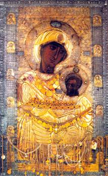 Иверская икона Божьей Матери. Иверский монастырь. История Иверской иконы начинается с первого века, когда Божия Матерь благословила святого апостола и евангелиста Луку написать её изображение ещё во дни Своей земной жизни. Преподобный Иоанн Дамаскин писал: "Святой апостол и евангелист Лука, в то время, когда Пресвятая Матерь Божия жила ещё в Иерусалиме и обитала в Сионе, написал живописными средствами Её Божественный и честный образ на доске, дабы как в зеркале созерцали её последующие поколения и роды. Когда Лука представил Ей сие изображение, Она сказала: "Отныне ублажат Мя все роды. Благодать и сила Рождшагося от Меня и Моя с вами да будет". Предание приписывает кисти святого апостола и евангелиста Луки от трёх до семидесяти икон Божией Матери, в том числе и Иверскую. Свое же название икона получила благодаря следующим событиям. В IX веке, во времена греческого императора Феофила, прозванного Иконоборцем, истинные православные подвергались гонениям, видных деятелей Церкви отстраняли от служения, многие верующие были казнены, а иконы и мощи святых сжигались. Один из ликов Богородицы, написанных Лукой, находился у благочестивой вдовы, жившей близ города Никеи. Воины, уничтожавшие святые иконы, пришли в дом этой христианки, и один воин копьем ударил по образу Богородицы. Тотчас из пораженного места потекла кровь. Вдова, боясь уничтожения святыни, пообещала императорским воинам деньги и просила их до утра не трогать икону. Когда же они ушли, женщина вместе с сыном (впоследствии афонским иноком) для сохранения святой иконы опустила ее в море.