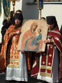 Иверская икона Божьей Матери в Троице-Владимирском храме По благословению архиепископа Новосибирского и Бердского Тихона один раз в году, вечером в понедельник Светлой седмицы, образ привозится в Троице-Владимирский храм на Западном жилмассиве Новосибирска, который является подворьем Михаило-Архангельского монастыря. На вечерней службе поётся акафист Иверской иконе Божией Матери. Летом 2012 года обновившуюся икону пронесли крестным ходом по селу Решеты. К слову, с тех пор, как началась эта история мытарства чудотворной иконы, в селе церкви нет. Но все чаще стал подниматься вопрос о необходимости ее возведения. Велики и чудны дела Твои, Господи Боже Вседержитель. Праведны и истинны пути Твои, Царь Святый. История святого образа символична, в ней, как в капле воды, отразилась трагичная история русского народа в прошедшем веке. Молитвами простой русской женщины, пострадавшей в годы гонений за православную веру, был возвращен людям святой образ Матери Божией, которая является ныне покровительницей Михаило-Архангельского мужского монастыря и утешительницей всех, с верою к Ней приходящих. Приложение Впервые точный список с Иверской иконы Божией Матери был привезен с Афона в Москву 13 октября 1648 года и временно помещен в Никольском монастыре. Спустя некоторое время его отправили в Валдайский Иверский монастырь, а для Москвы по повелению Алексея Михайловича монастырю заказали сделать точную копию с привезённого из Афона списка. Прибывший в Москву список, сделанный русскими иконописцами, поместили при триумфальных Неглиненских воротах Китай-города, через которые традиционно совершались въезды русских царей на Красную площадь. В 1669 году эти ворота были перестроены и названы Воскресенскими. Для защиты иконы от ветра и дождя был сделан небольшой деревянный навес, а позже в 1680 году воздвигли часовню, где служили монахи Иверской общины . По традиции, всякий идущий на Красную площадь или Кремль, перед входом в ворота прикладывался к иконе, под воротами мужчинам полагалось проходить без шапки. Часто Иверскую икону в особых каретах возили по домам москвичей, просивших отслужить молебен у постелей больных или просто под своим кровом. Чтобы часовня не пустовала, был сделан точный список с иконы, который замещал её во время отсутствия. Тесный храм, открытый круглые сутки, всегда был заполнен молящимися. Часовня упоминается в произведениях Льва Толстого, Ивана Бунина, Ивана Шмелёва, Герберта Уэллса, Марины Цветаевой: А вон за тою дверцей, Куда народ валит, - Там Иверское сердце Червонное горит.
