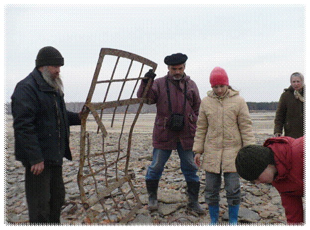 Это было старинное кладбище. Значит, где-то недалеко должен был стоять и храм. Ведь раньше вся жизнь человека от рождения до смерти была связана с храмом. Здесь крестили, венчали, причащали, соборовали, отпевали. Кладбища располагались недалеко от церкви [1]. И вот мы подошли к месту, где, по предположению Михаила Михайловича, раньше стоял храм. Груда камней, кое-где видны остатки фундамента, размытого морем, лежит железная решетка. Может, от входной двери? Увидели кусочки синего стекла. Может, от лампадки?