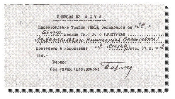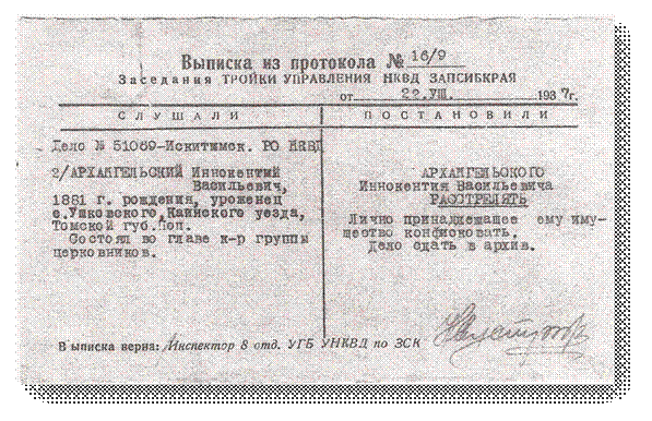 Михаил Михайлович рассказал нам, что дальше к морю было найдено еще одно захоронение. Там в 70-х годах прошлого века так же весной обнажилась могила, выложенная кирпичом, в которой на хорошо сохранившемся теле лежали крест и Евангелие. Как известно, православных священников хоронят с Евангелием и крестом. Так что, по всей очевидности, это были нетленные останки почившего священника. Считается, что сохранность тела – одно из свидетельств святости. Как жил на земле этот человек, нам неизвестно, и, наверное, это уже трудно установить. Но хочется верить, что жил в этом селе святой угодник Божий. Мы подумали, что, может быть, именно в этом месте был похоронен священник Аполос Киселев, надгробная плита с могилы которого сейчас хранится в завьяловском православном лагере. Ведь он умер в возрасте 35 лет, а в могиле, по рассказам очевидцев, у человека были длинные черные волосы без седины. Много тайн сокрыто на дне Обского моря. И нам очень захотелось хоть некоторые из них раскрыть. После экспедиций стали тщательно изучать материалы и документы, которые нам дал о. Игорь Затолокин. Мы хотели побольше узнать о Свято-Троицкой церкви в с. Тулинском, о священниках, там служивших. Церковь в селе Тулинском была построена в 1866 г. и освящена в честь Святой Троицы. Была она деревянная, однопрестольная. В состав прихода входили: с. Тулинское, деревни: Бороздина, - 7 верст от Тулинского, Гуселетова - 10 верст, Бурмистрова - 12 верст, Стольникова - 9 верст, Улыбино - 15 верст. В 1914 году было 6440 прихожан. В приходе было 3 школы, одна - церковно–приходская, две - гражданского ведомства. Земли: 100 десятин пахотной и сенокосной и 7 десятин лесного надела. В разное время в храме служили: священник Алексий Феодорович Сосунов с 1894 г., диакон Константин Михайлович Верещагин с 1913г., псаломщик Алексий Степанович Добронравов с 1909 г. [2]. В 1919-1920 гг. здесь несколько месяцев жил и служил священник Василий Васильевич Топорков. Последним священником, служившим в этом храме, был Иннокентий Васильевич Архангельский, в 1937 году расстрелянный по приговору тройки УНКВД Запсибкрая. Основные сведения о жизни о. Иннокентия Архангельского мы узнали из анкеты на служителя религиозного культа, составленной 17 июля 1930 года и анкеты арестованного, составленной 5 августа 1937 года: Архангельский Иннокентий Васильевич родился 2 марта 1981 года в Томской губ., Кайнского уезда, с. Ушковское в семье священника. Он закончил уездное училище. С 1914 года был священником с. Колмаковского, Каинского уезда, Томской губернии; в 1922 году - с. Суздальского, Каргатского уезда; в 1923 году – с. Решетовского, Каргатского уезда; с 1924 года – с. Тулинского, Бердского района, Новосибирского округа. А вот данные о его семье в 1937 году: жена Архангельская Миропия Александровна - не работает, сын Архангельский Геннадий Иннокентьевич - неизвестно где пребывает, дочь Архангельская Августина Иннокентьевна - 16 лет, дочь Клавдия Иннокентьевна - 25 лет, дочь Чернавина Ольга Иннокентьевна - г. Н-сибирск. И ещё деталь биографии в анкете: «в службе в белых и др. к-р армиях, участие в бандах и восстаниях против советской власти (когда и в качестве кого) - не участвовал»[3]. В храме Святой Троицы с. Тулинского о. Иннокентий прослужил 13 лет – с 1924 по 1937 год. Это были трагические годы для православной церкви и верующих людей. Особенно деревенских. Исчезло слово «кре