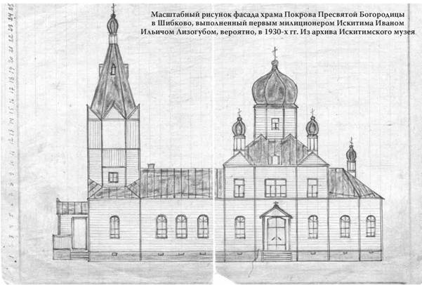 Работы по расчистке фундамента Главные орудия труда — лопата и топор Завершив все обмерные работы в Шибково, мы отправились в Новосибирск выполнять чертежи. Здесь были найдены типовой проект, по которому был построен храм , и фотографии церкви в с. Колбинка Молчановского района Томской области, выполненной по этому же проекту в 1911 г. и сгоревшей в июле 2009 г. По материалам обмеров фундамента храма, чертежам типового проекта, рисунку Ивана Ильича Лизогуба и фотографии фрагмента южного фасада Антоном Костиковым выполнена объемная модель храма и в программе «SketchUp» создан короткий фильм, позволяющий осмотреть здание снаружи и изнутри. Натальей Васильевой и Валентиной Гнеушевой проведены обмеры крестов с храма, установленные на могилах на сельском кладбище. Анастасией Кузевановой и Анастасией Капелевой графически восстановлены отсутствующие в типовом проекте западный и восточный фасады. Продолжается работа в архиве. Найдены имена священников, служивших в храме Покрова. Метрические книги храма, фиксировавшие сведения о совершении таинств крещения, браковенчания и обряда отпевания, хранящиеся в ГАНО, начинаются с марта 1917 года — возможно, это и есть время освящения храма. С марта по сентябрь записи выполнены священником Леонидом Горчаковским, в дальнейшем таинства совершал священник Михаил Жерновков, а с 21 октября 1917 г. ему сослужил псаломщик Михаил Анашкин. Дата закрытия храма, взятая из литературы, документально подтверждена (постановление о закрытии вынесено Облисполкомом 23.12.1938 г.). В июле 1939 г. здание церкви пустовало и не использовалось. Закончилась студенческая практика, но работа по восстановлению истории храма Покрова Пресвятой Богородицы в селе Шибково продолжается.