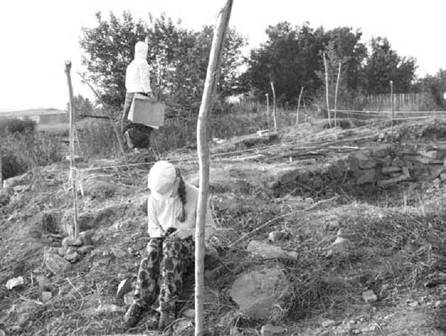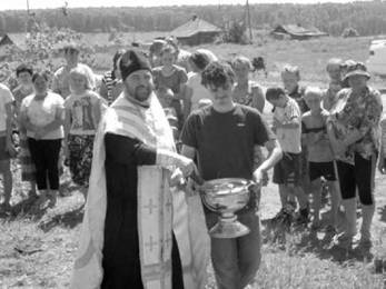 Фотография фрагмента южного фасада храма во время размещения в нем клуба, 60-е годы ХХ века Знакомство с историей Шибкова началось со школьного музея, где хранится фотография фрагмента фасада храма во время размещения в нем клуба и масштабный рисунок этого же фасада, выполненный первым милиционером Искитима Иваном Ильичом Лизогубом, вероятно, в 1930-х гг., когда здание оставалось сохранным, а ликвидированы были только колокола. Эти документы стали отправными точками наших поисков. После первого осмотра фундамента храма все поняли, что главными орудиями будут лопата и топор. Разочарование от увиденного сменилось горячим желанием понять, как все выглядело когда-то. Закипела работа. Были расчищены все углы здания, в них установлены колышки, натянут шнур. Это позволило даже в недоступных местах зафиксировать толщину фундамента, а в двух местах удалось обнаружить остатки обгорелых брусьев и увидеть, как опирались деревянные стены на фундамент. В углах здания были найдены горки гвоздей, что говорит о том, что стены были обшиты рейкой-шалевкой, закрепленной по углам вертикальными досками, имитировавшими пилястры. 26 июня мы ждали приезда батюшки. К развалинам пришли сотрудники сельсовета, библиотеки, женщины с ребятишками, пенсионеры (это было в самый разгар рабочего дня). Благочинный Южного округа иерей Игорь Затолокин совершил водосвятный молебен на месте западной паперти храма Покрова Пресвятой Богородицы, где предполагается установка поклонного креста, окропил святой водой расчищенный фундамент и благословил всех присутствовавших.