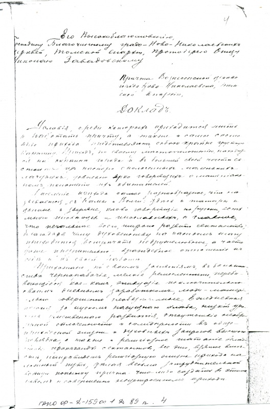 Господину Благочинному градо-Ново-Николаевских церквей, Томской епархии, протоиерею отцу Николаю Завадовскому Причта Вознесенской церкви города Ново-Николаевска Томской епархии ДОКЛАД