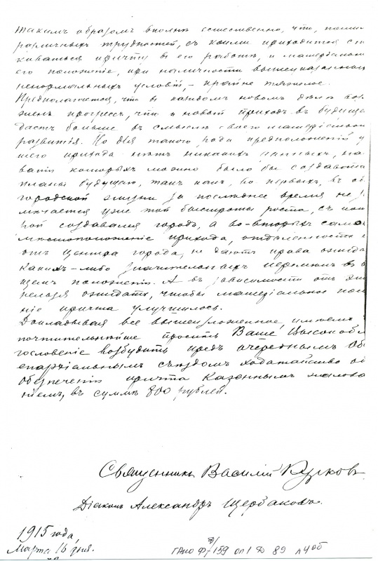 Условия, среди которых приходится жить и работать причту, а также и самое состояние прихода представляет собой крайне грустную картину. Приход, по своему местоположению находится на окраине города и в большей своей части состоит из наскоро сколоченных маленьких лачужек, довольно ярко говорящих о материальном положении их обитателей. Население прихода самое разнообразное, что называется «с Камы и Волги»: здесь и татары и цыгане и зыряне, плохо говорящие по-русски, есть много иноверцев и инославных, а главное, что печальнее всего, широко развито сектантство, благодаря чему духовенству на каждом шагу приходится встречать недружелюбие, а часто даже презрительно – враждебное отношение к себе и к своей работе. Прихожане, по своим занятиям, в основном чернорабочие, мелкие ремесленники, перебивающиеся кое-как, живущие исключительно своим дневным заработком, люди – материально совершенно необеспеченные. Ежедневная погоня за куском насущного хлеба, низкий уровень умственного развития, отсутствие необходимой сплоченности и солидарности в общеприходской жизни и духовных запросов высшего порядка, а также и религиозное шатание вследствие пропаганды сектантов, все это, взятое вместе, направляет религиозную жизнь прихода на ложный путь, делая весьма затруднительной всякую попытку причта что-либо создать в этом новом и совершенно не неустроенном приходе. Таким образом, вполне естественно, что, помимо различных трудностей, с какими приходится сталкиваться причту в его работе, и материальное его положение, при наличности вышеуказанных ненормальных условий, - крайне тяжелое. Предполагается, что в каждом новом деле возможен прогресс, что и новый приход в будущем даст больше в смысле своего материального развития. Но для такого рода предположений у нашего прихода нет никаких данных, на основании которых можно было бы создавать планы на будущее, так как, во-первых, в общегородской жизни за последнее время не замечается уже той быстроты роста, с которой создавался город, а во-вторых, самое местоположение прихода, отдаленность его от центра города, не дают права ожидать каких-либо значительных перемен в общем положении. А в зависимости от этого нельзя ожидать, чтобы материальное положение причта улучшилось. Докладывая все вышеизложенное, имеем честь почтительнейше просить Ваше Высокоблагословение возбудить перед очередным общеепархиальным съездом ходатайство об обеспечении причта казенным жалованием, в сумме 800 рублей. Священник Василий Курков