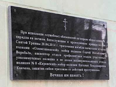 Теперь на стене здания храма, у которого произошла трагедия, установлена памятная доска. Здесь же растут рябина и липа — деревца посадили школьники 49-й школы в память о самоотверженных сотрудниках полиции.