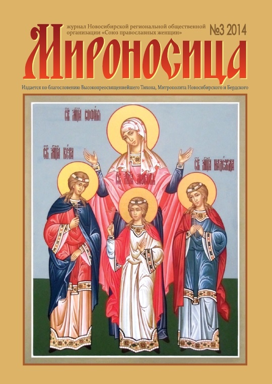 Вышел в свет третий номер женского православного журнала "Мироносица"Всечестные отцы, дорогие братья и сестры! По благословению Митрополита Новосибирского и Бердского Тихона вышел в свет третий номер женского православного журнала "Мироносица" Новосибирской региональной общественной организации "Союз православных женщин". Главный редактор – Пендюрина Татьяна Викторовна, заслуженный работник культуры РФ, член союза журналистов России.