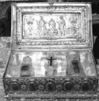почитаемую левую руку благодатной святой мироносицы равноапостольной Марии Магдалины, которая уже две тысячи лет нетленна и благоухает. Вторая святыня, к которой вы приложитесь, – это нетленная ножка святого мученика Кирика, который героически пострадал в трехлетнем возрасте. Еще одно великое сокровище, которое находится с нами, – это часть Животворящего Креста Христова. Три сокровища нашего монастыря, которые в этот час перед нами, находятся в искусно сделанном святогорском ковчеге. Ваше Высокопреосвященство, как известно, святые мощи всегда