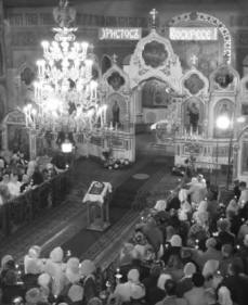 вступает в сияющий огнями храм. Начинается пение Пасхального