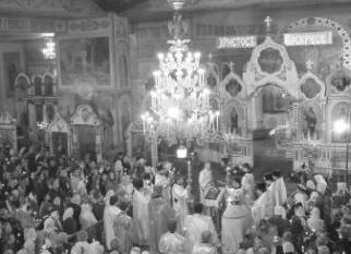 и кадилами, окруженные молящимися с зажженными свечами, под радостный